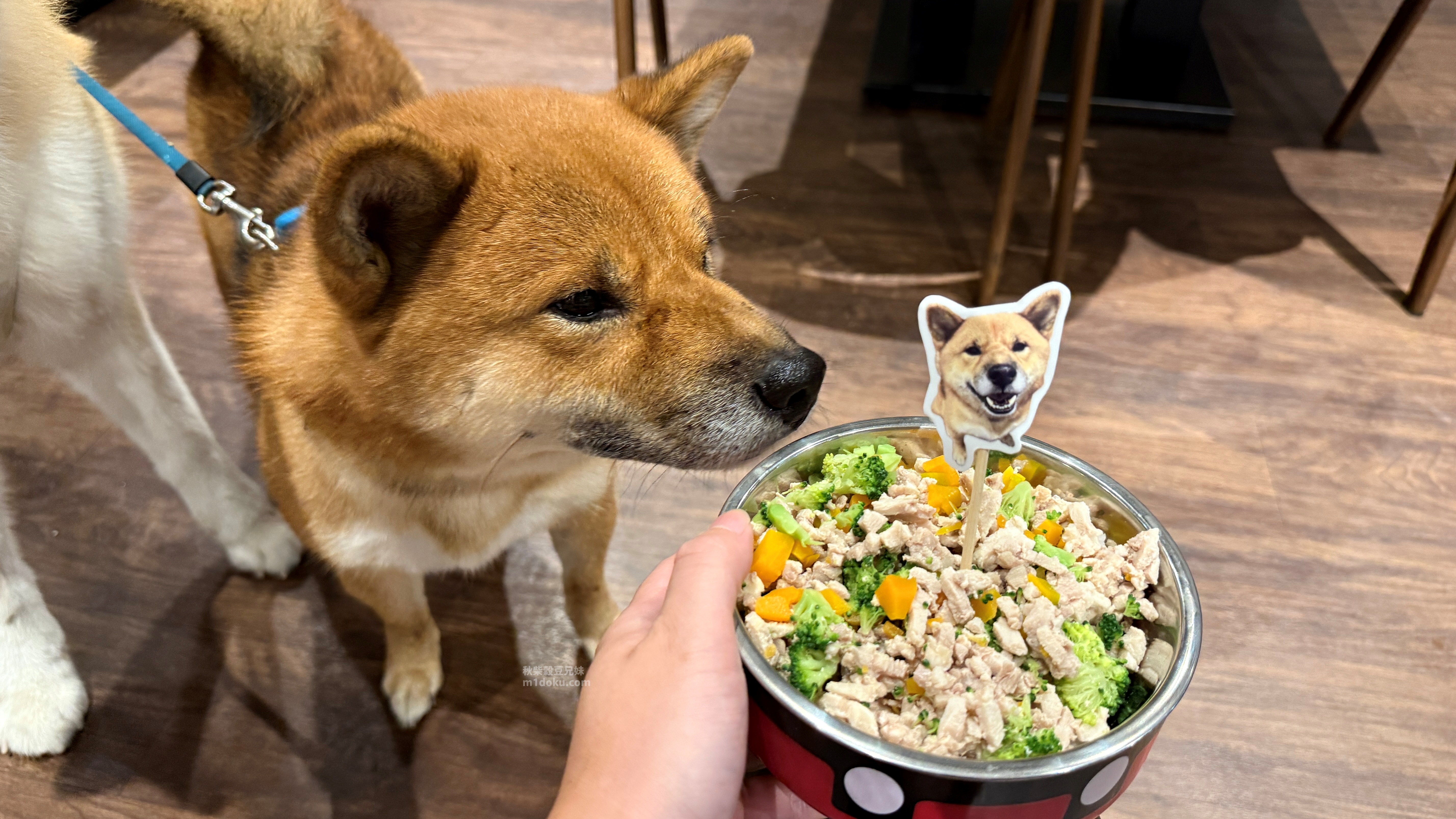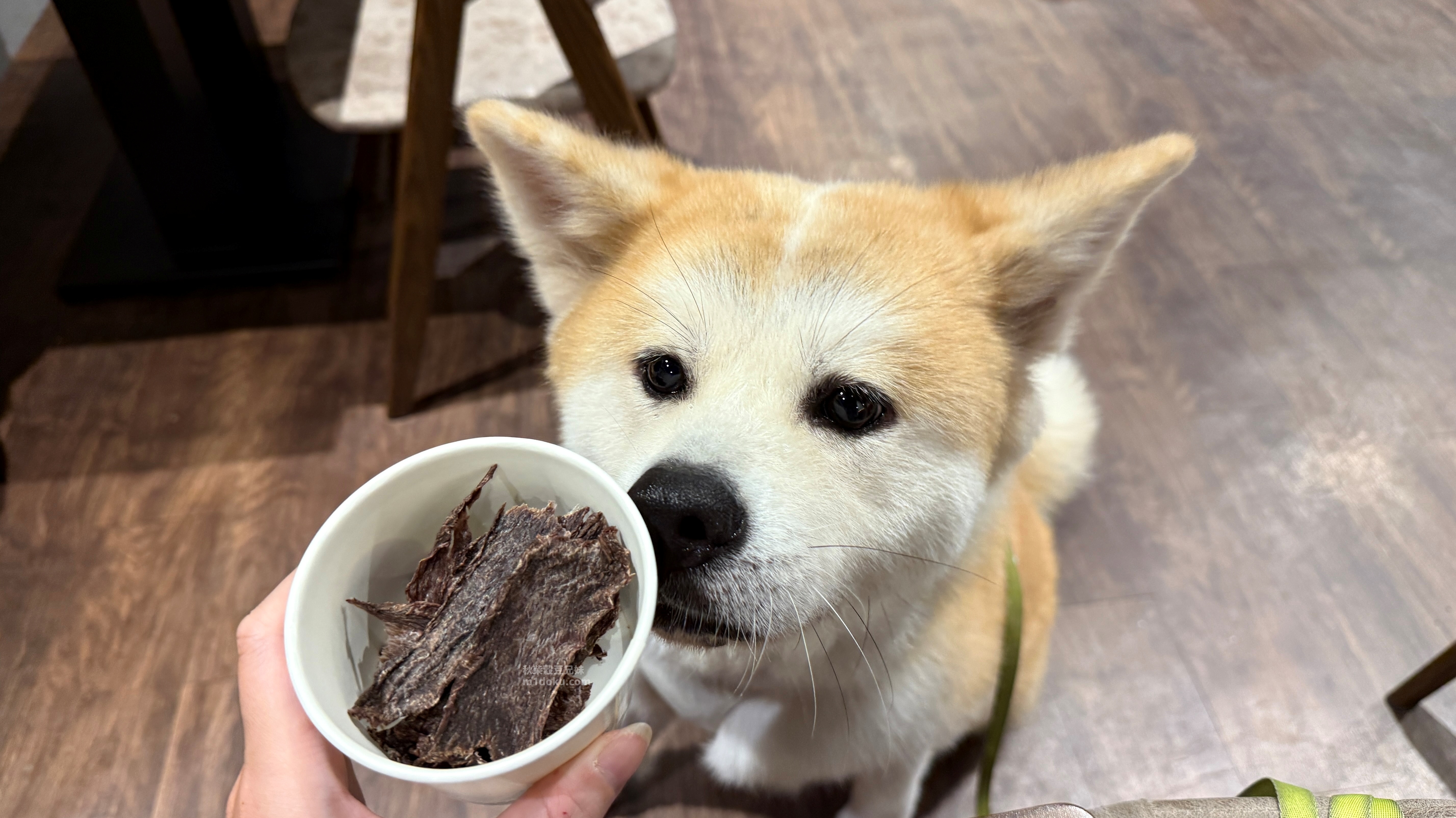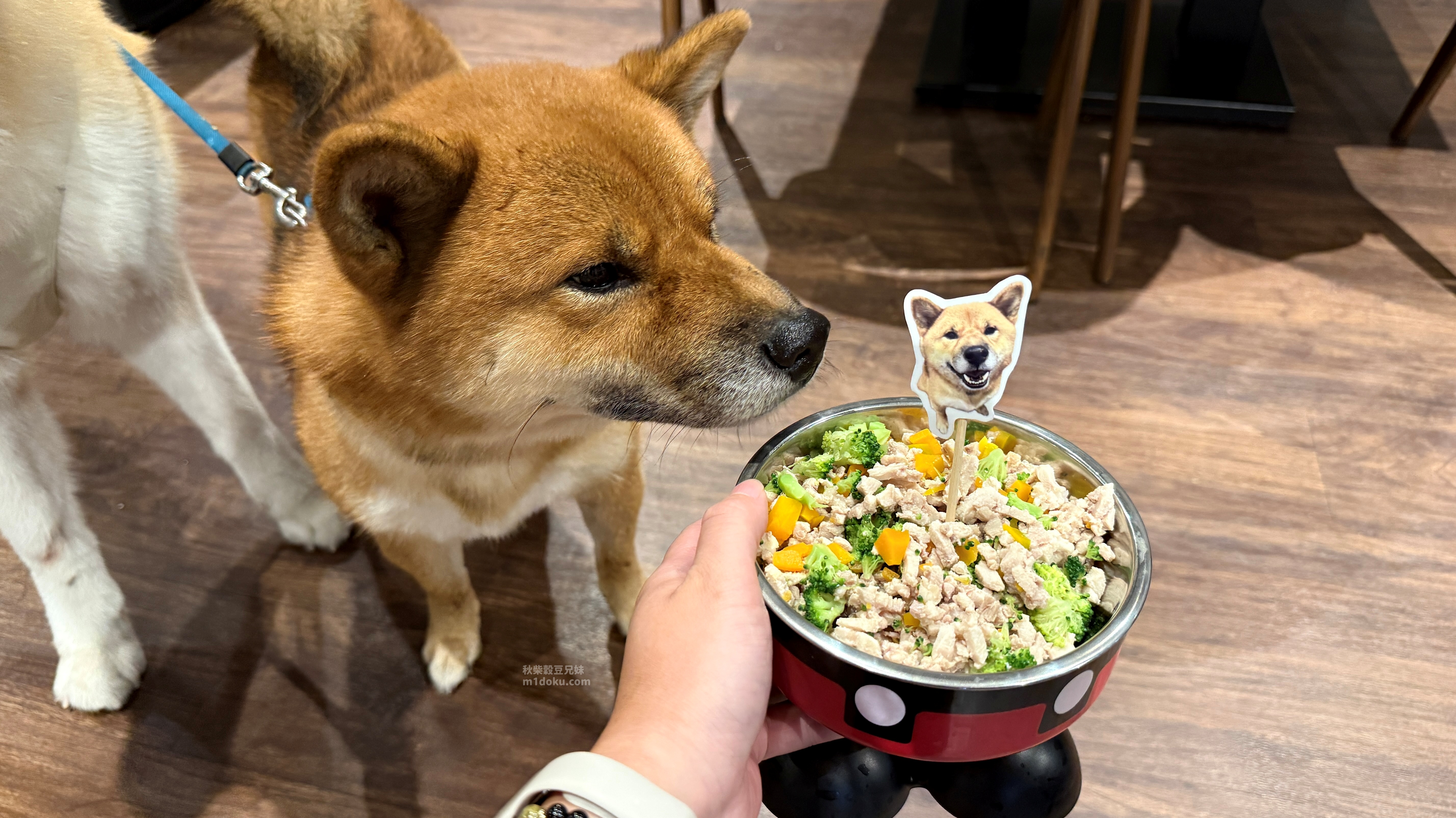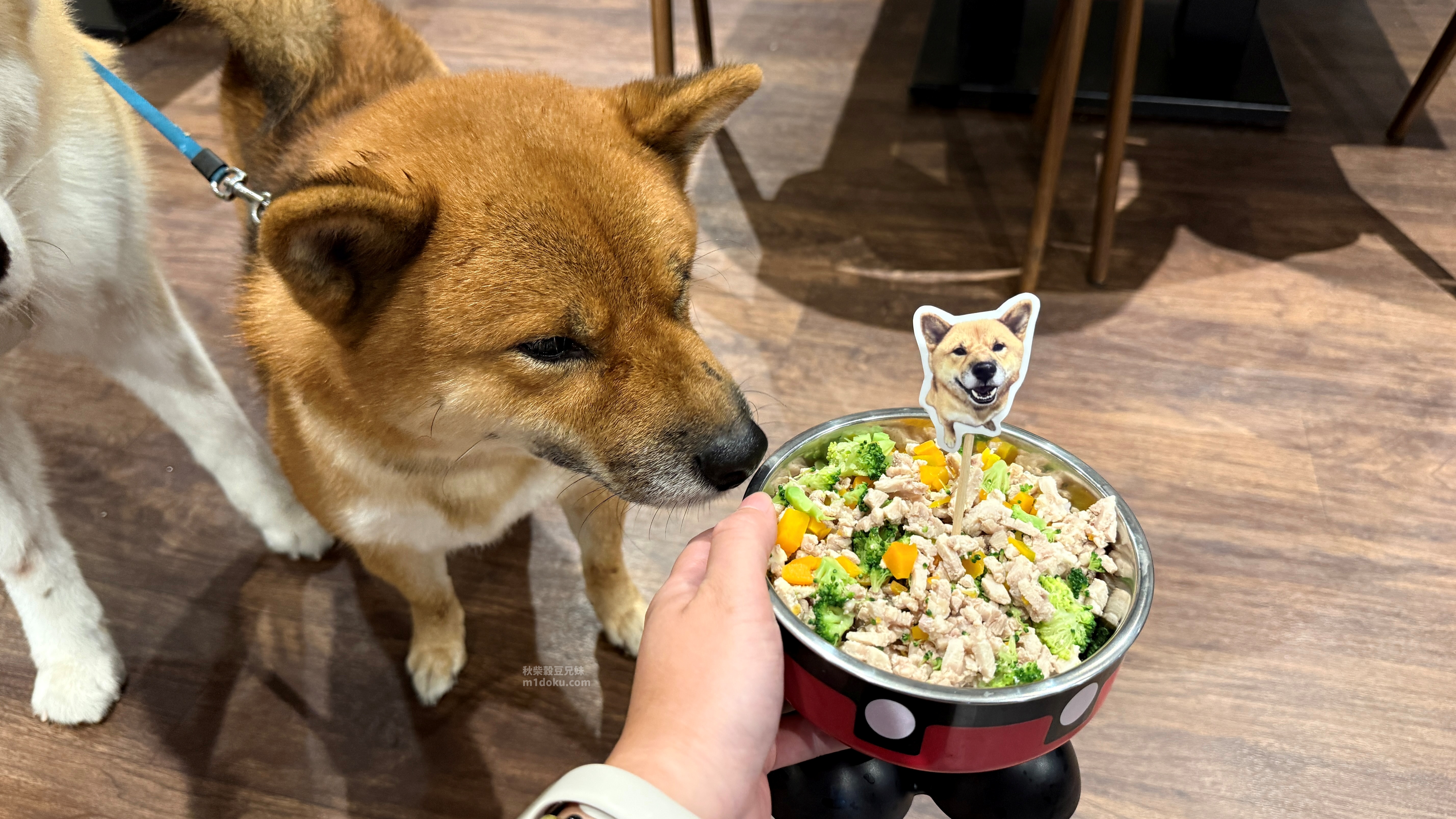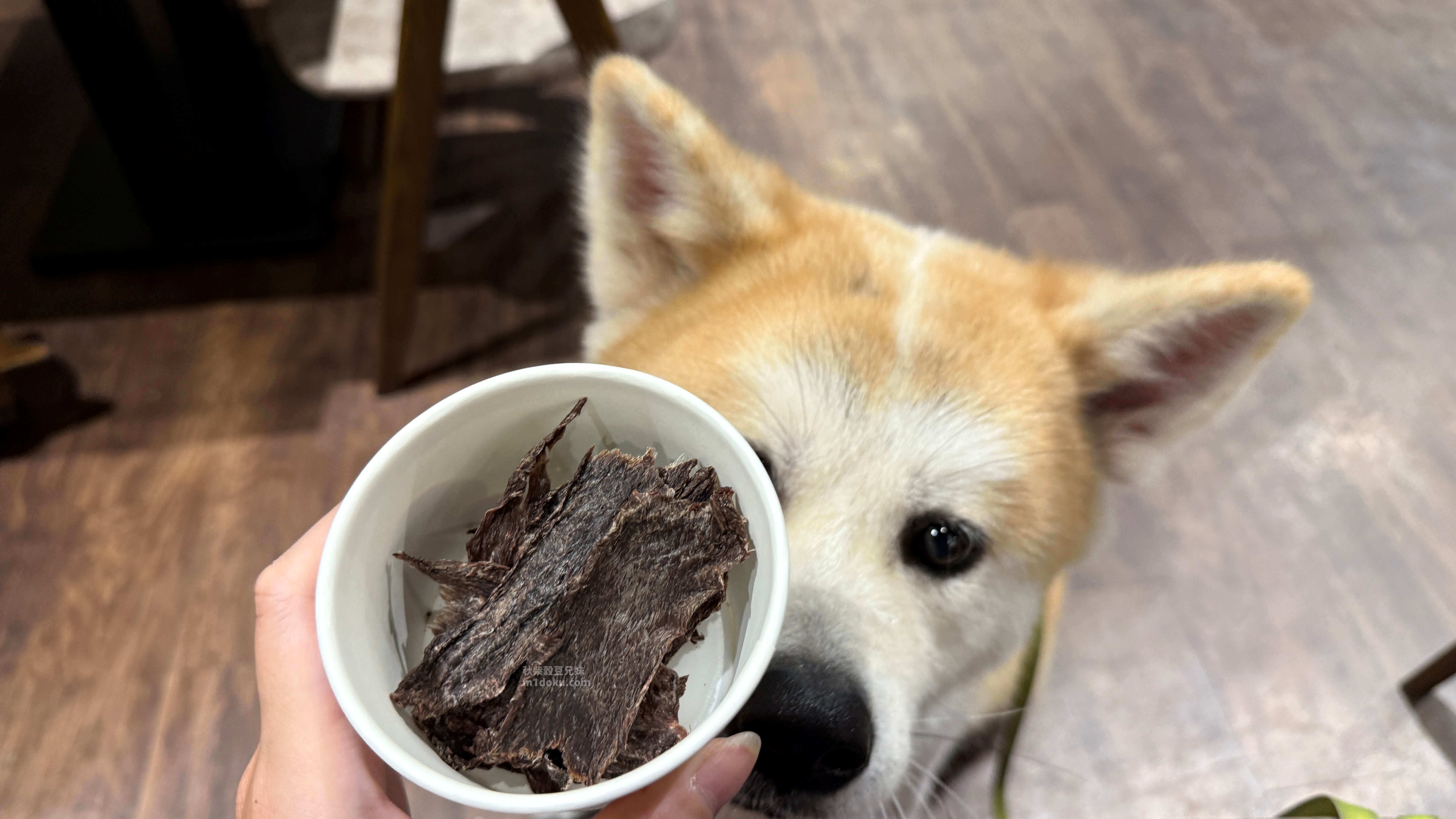 另外不得不提到的是店家對毛孩超級有心!每天沒有販售完的新鮮溫體牛,店家決不浪費,使用低溫慢烘+紫外線殺菌的方式,製作成天然的溫體牛肉乾,分享給所有來店的毛孩們,完全沒加調味,保留了牛肉本身的營養及香氣,讓狗狗能安心吃乾淨又健康!才一送上,連馬麻我整個都被驚呼到,心裡想「哇賽,小狗也太幸福吃太好了吧(大笑)」米豆、米穀就立刻變身超級小吃貨,一直討著要吃,完全被寵壞XD。不只送上毛孩專屬溫體牛肉乾,接著還有寵物餐選擇,店員會先問毛孩是否有過敏的食材,針對毛孩過敏的食材去做調整,整碗滿滿的肉肉加上蔬菜,米豆吃的是雞肉南瓜花椰菜、米穀吃的是豬肉南瓜花椰菜,現場還會製作毛孩專屬的大頭小旗子,整體的小細節都讓我心被融化了,有夠感動的QQ。(寵物餐點內容依店家當日提供為主)