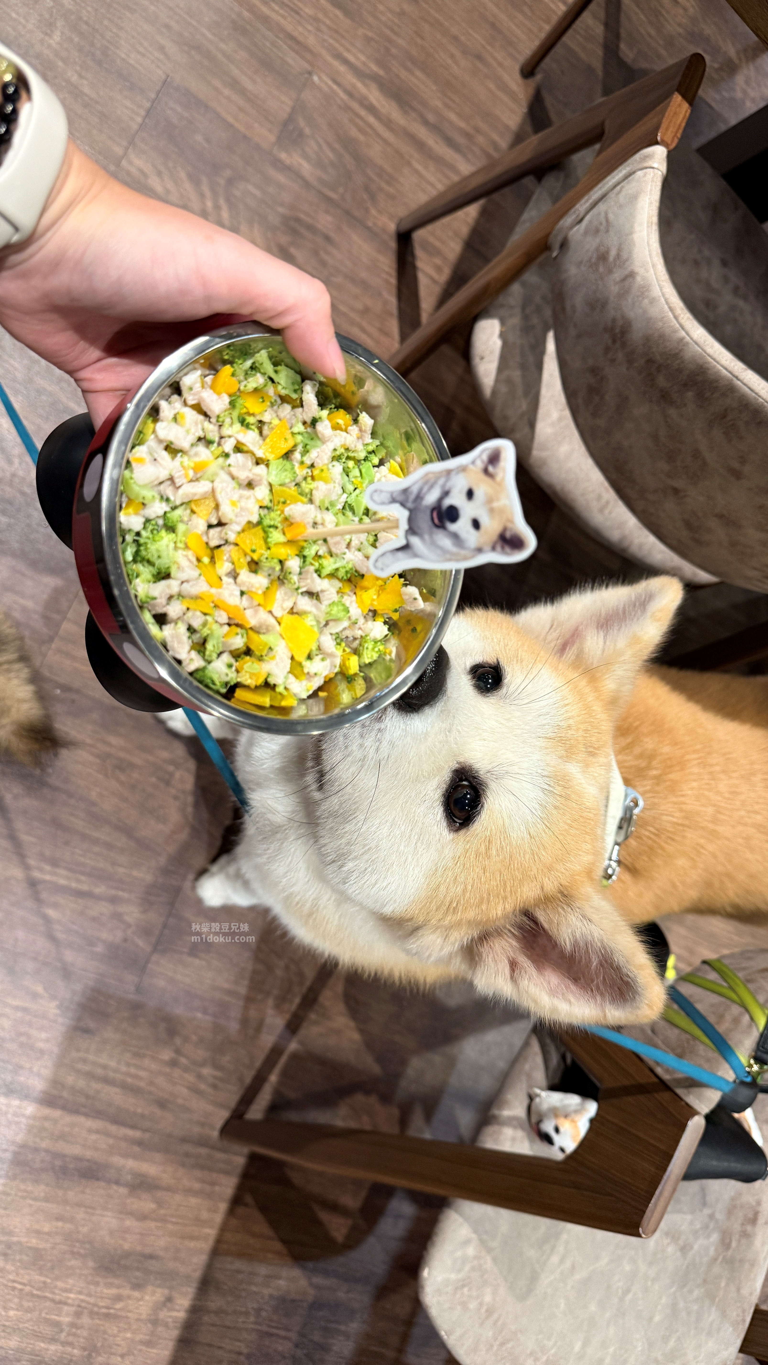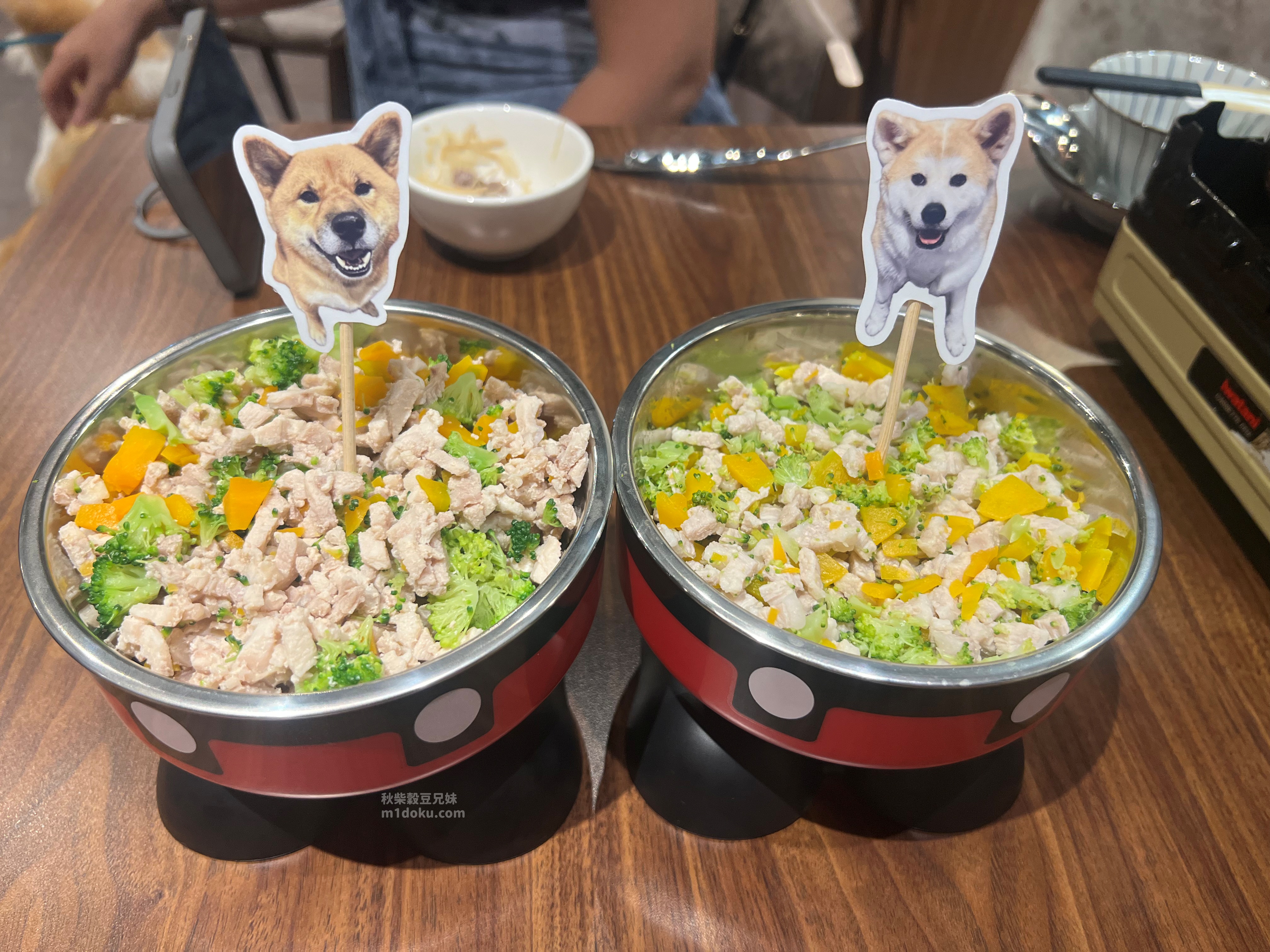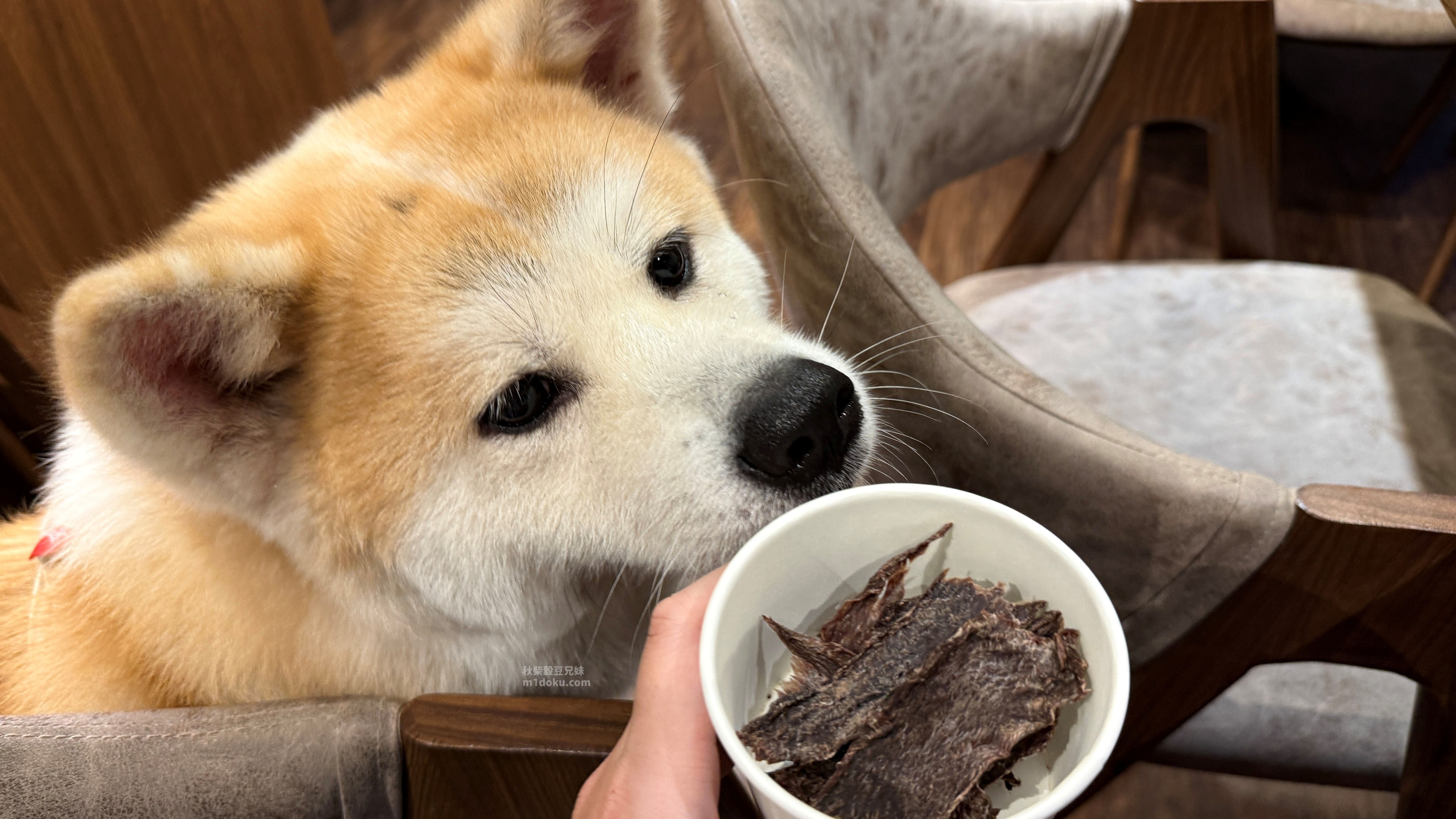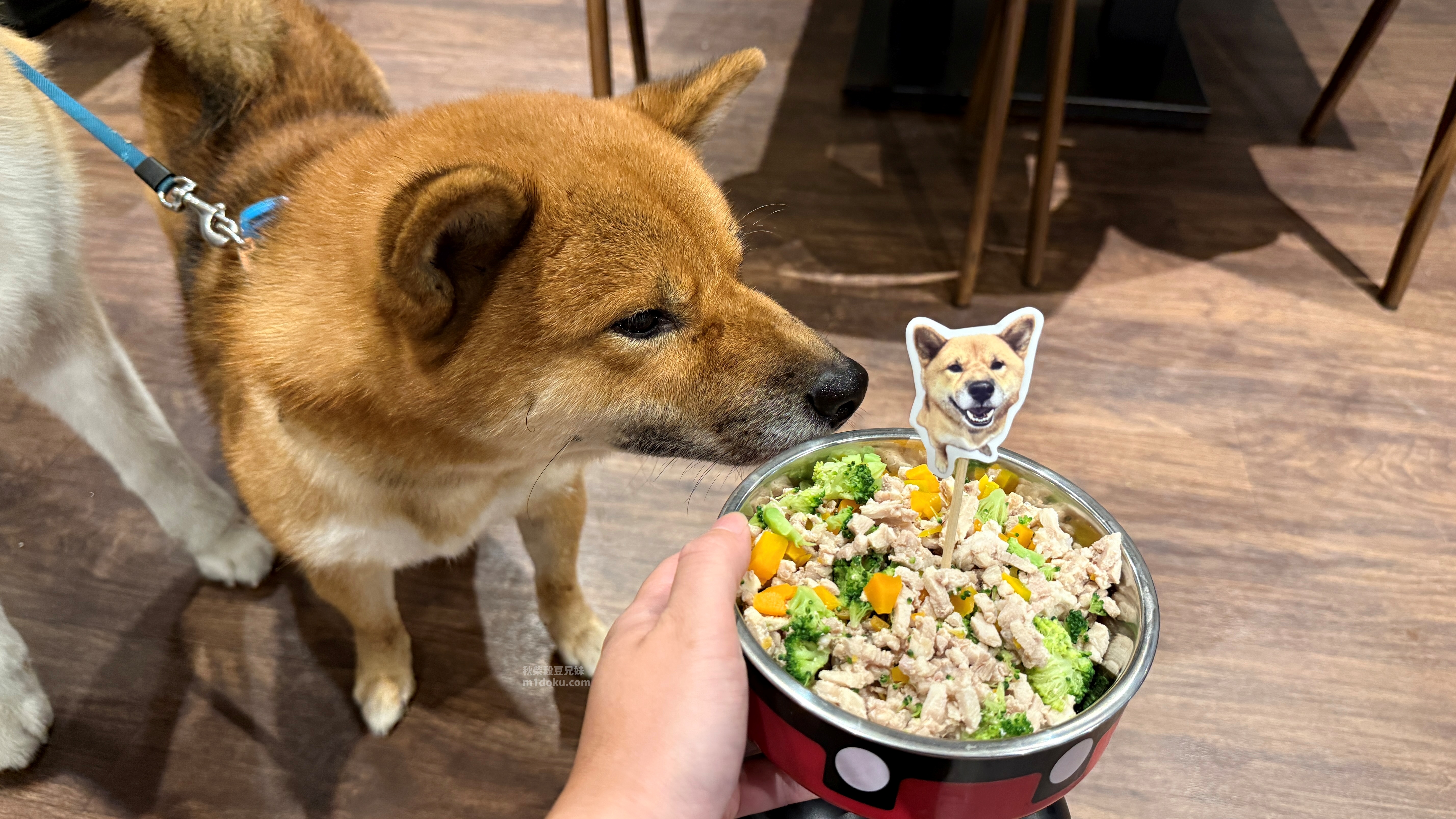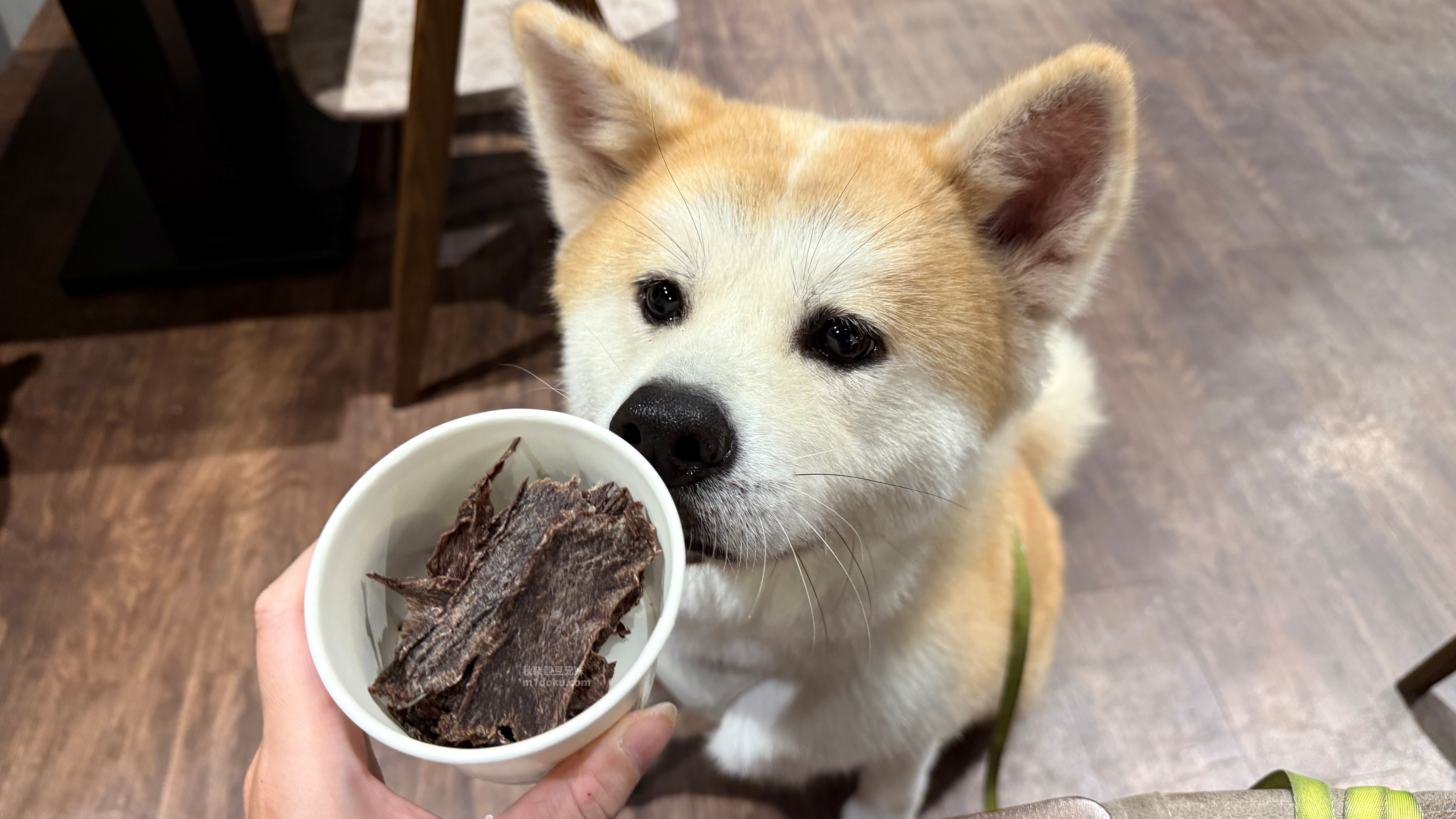 另外不得不提到的是店家對毛孩超級有心!每天沒有販售完的新鮮溫體牛,店家決不浪費,使用低溫慢烘+紫外線殺菌的方式,製作成天然的溫體牛肉乾,分享給所有來店的毛孩們,完全沒加調味,保留了牛肉本身的營養及香氣,讓狗狗能安心吃乾淨又健康!才一送上,連馬麻我整個都被驚呼到,心裡想「哇賽,小狗也太幸福吃太好了吧(大笑)」米豆、米穀就立刻變身超級小吃貨,一直討著要吃,完全被寵壞XD。不只送上毛孩專屬溫體牛肉乾,接著還有寵物餐選擇,店員會先問毛孩是否有過敏的食材,針對毛孩過敏的食材去做調整,整碗滿滿的肉肉加上蔬菜,米豆吃的是雞肉南瓜花椰菜、米穀吃的是豬肉南瓜花椰菜,現場還會製作毛孩專屬的大頭小旗子,整體的小細節都讓我心被融化了,有夠感動的QQ。(寵物餐點內容依店家當日提供為主)