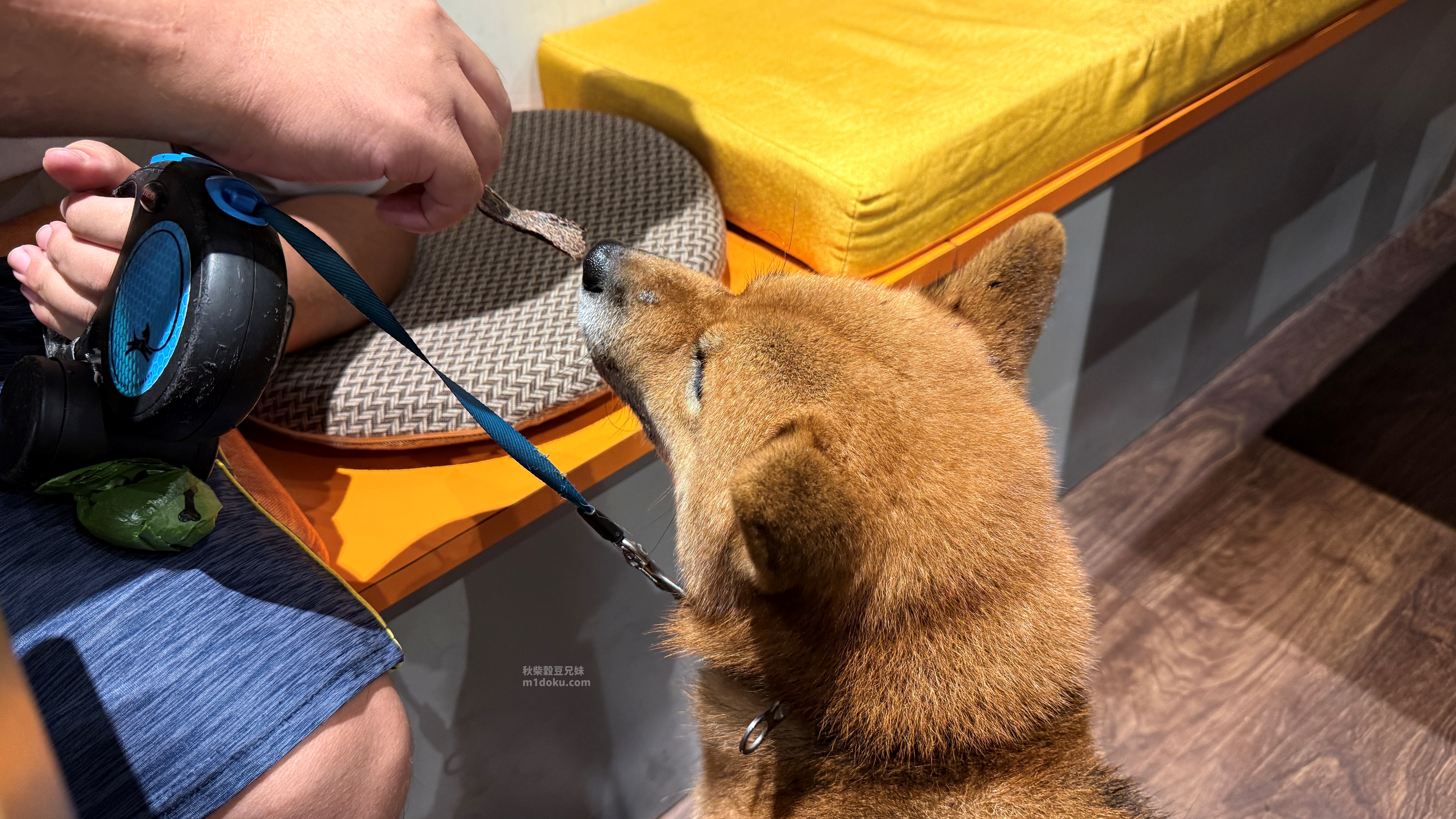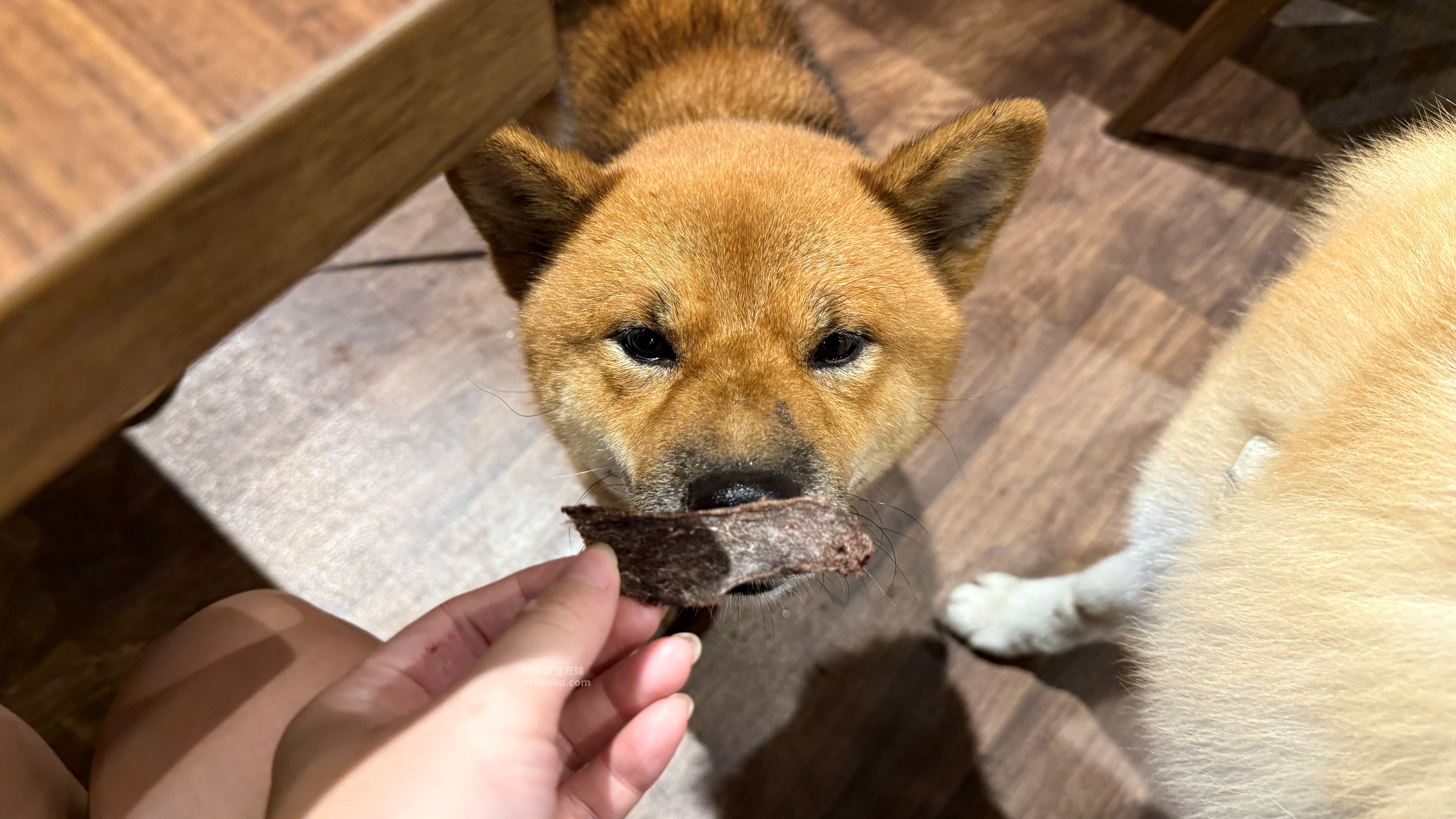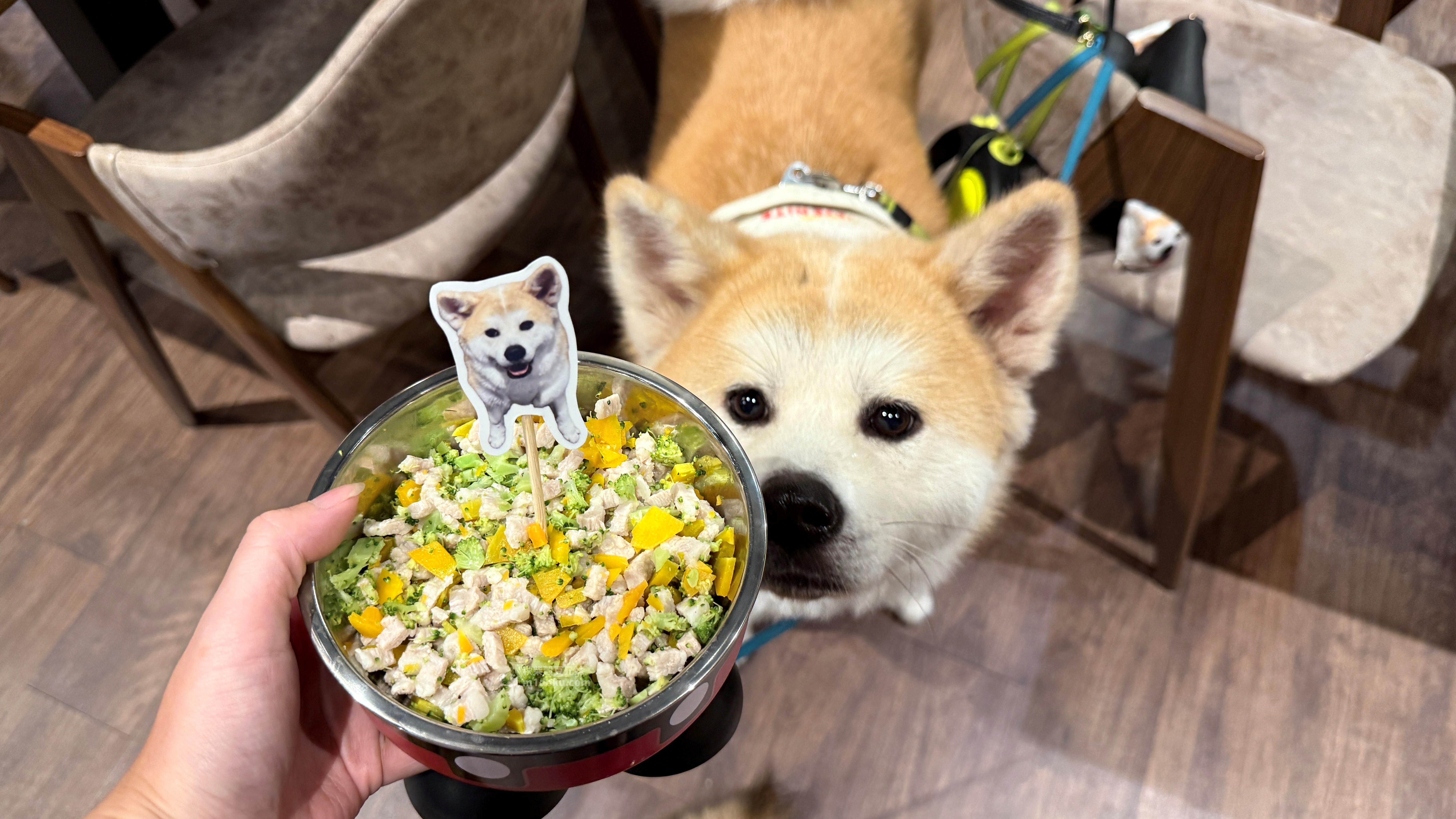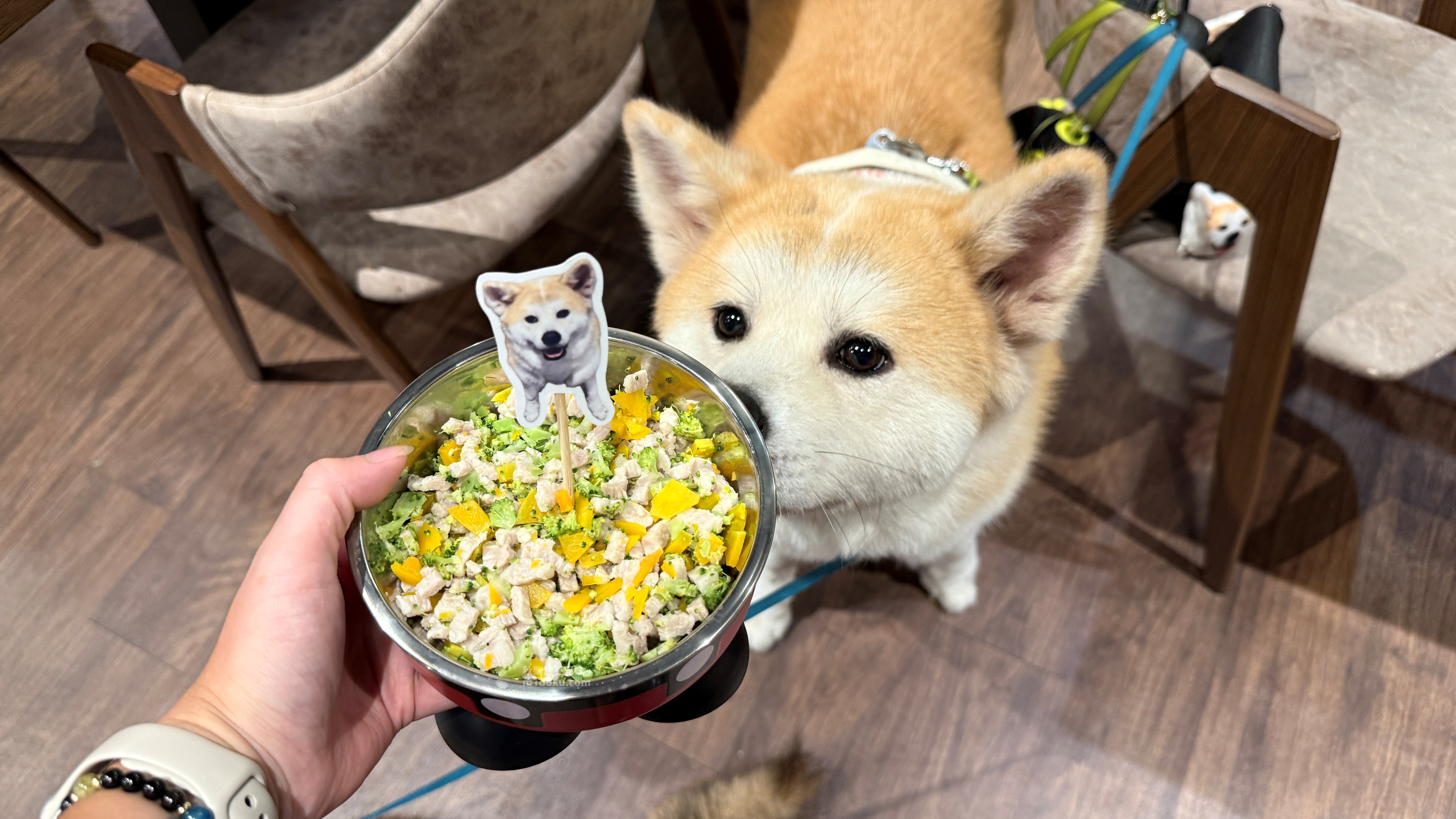 另外不得不提到的是店家對毛孩超級有心!每天沒有販售完的新鮮溫體牛,店家決不浪費,使用低溫慢烘+紫外線殺菌的方式,製作成天然的溫體牛肉乾,分享給所有來店的毛孩們,完全沒加調味,保留了牛肉本身的營養及香氣,讓狗狗能安心吃乾淨又健康!才一送上,連馬麻我整個都被驚呼到,心裡想「哇賽,小狗也太幸福吃太好了吧(大笑)」米豆、米穀就立刻變身超級小吃貨,一直討著要吃,完全被寵壞XD。不只送上毛孩專屬溫體牛肉乾,接著還有寵物餐選擇,店員會先問毛孩是否有過敏的食材,針對毛孩過敏的食材去做調整,整碗滿滿的肉肉加上蔬菜,米豆吃的是雞肉南瓜花椰菜、米穀吃的是豬肉南瓜花椰菜,現場還會製作毛孩專屬的大頭小旗子,整體的小細節都讓我心被融化了,有夠感動的QQ。(寵物餐點內容依店家當日提供為主)
