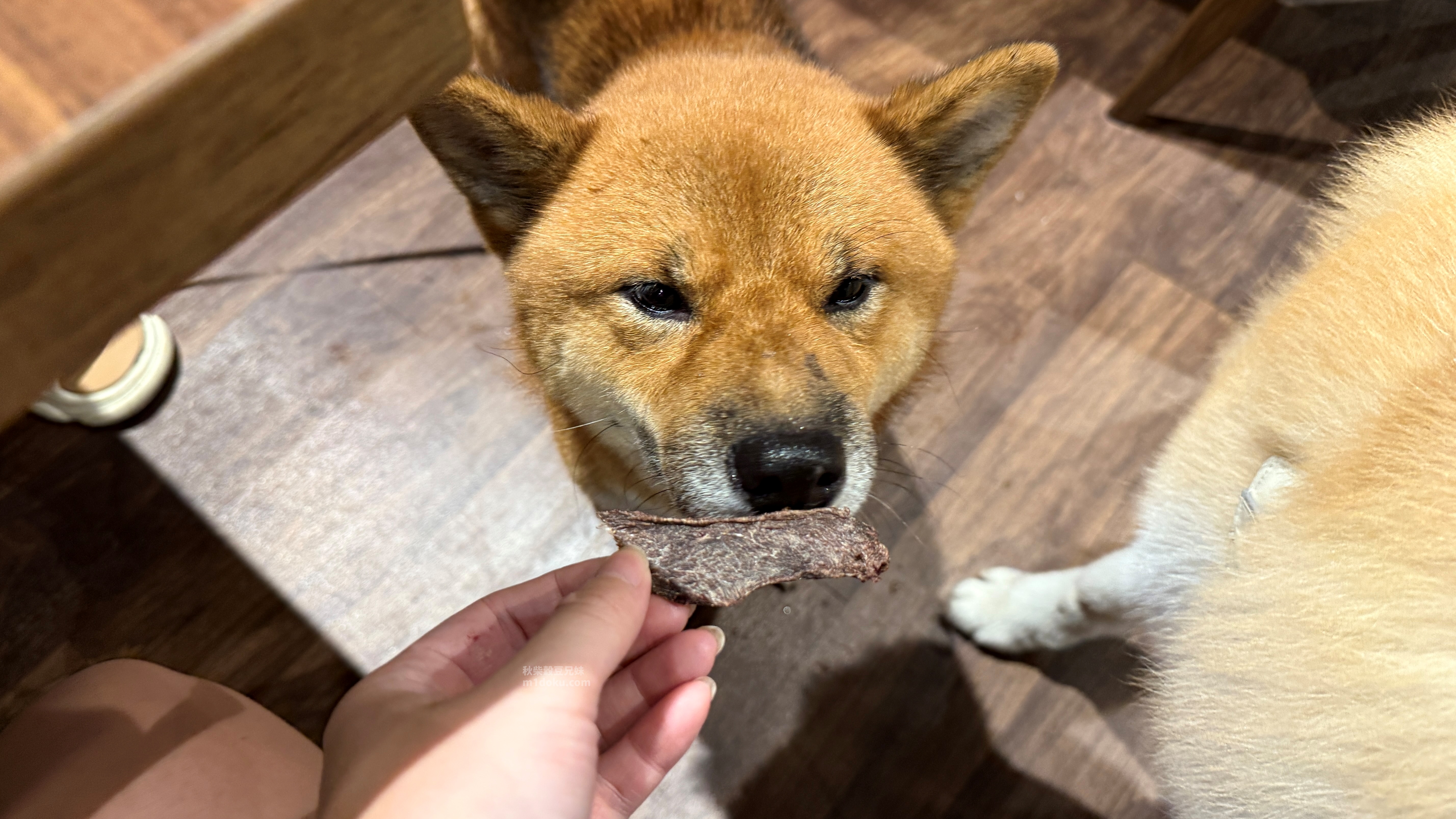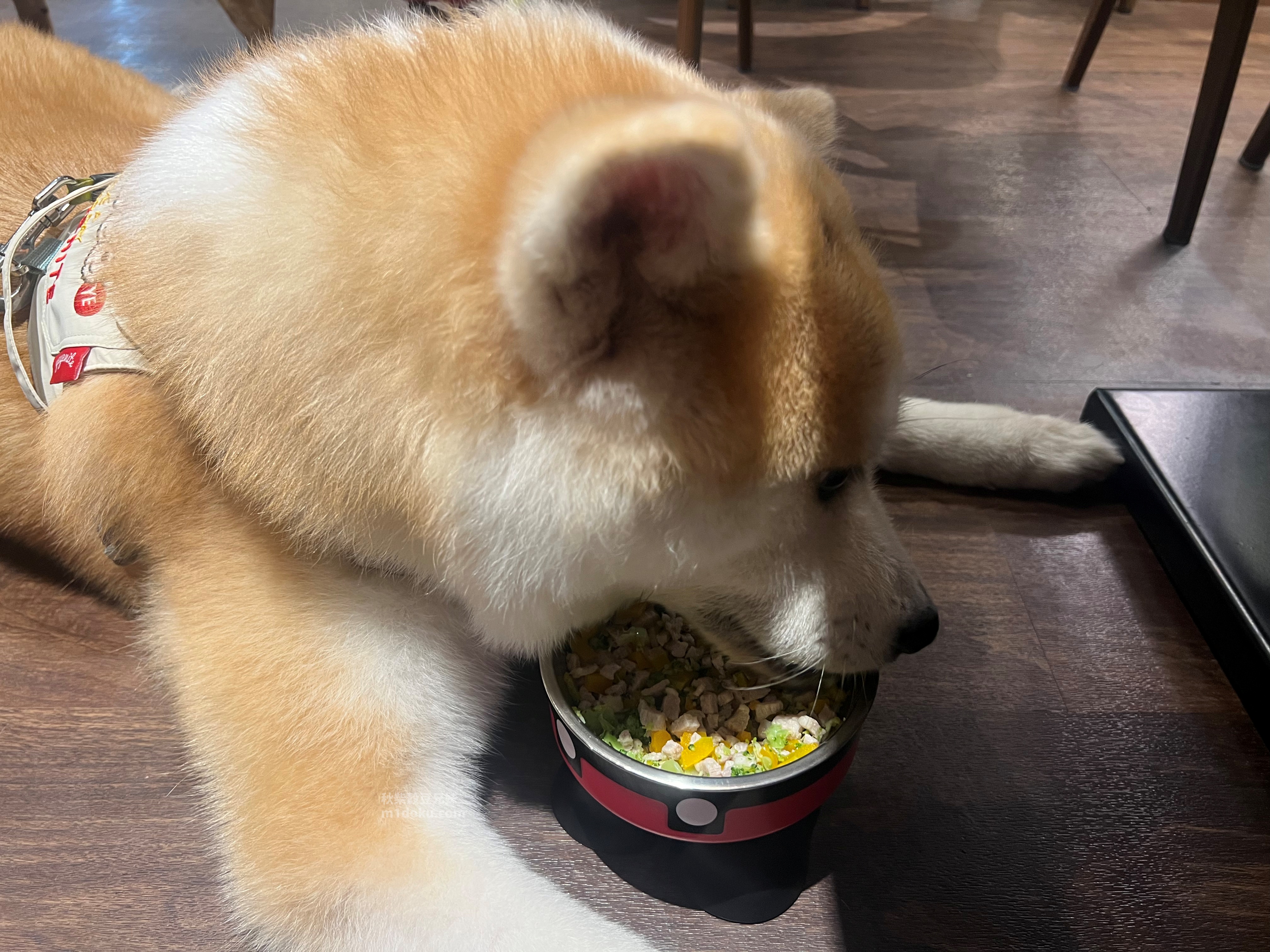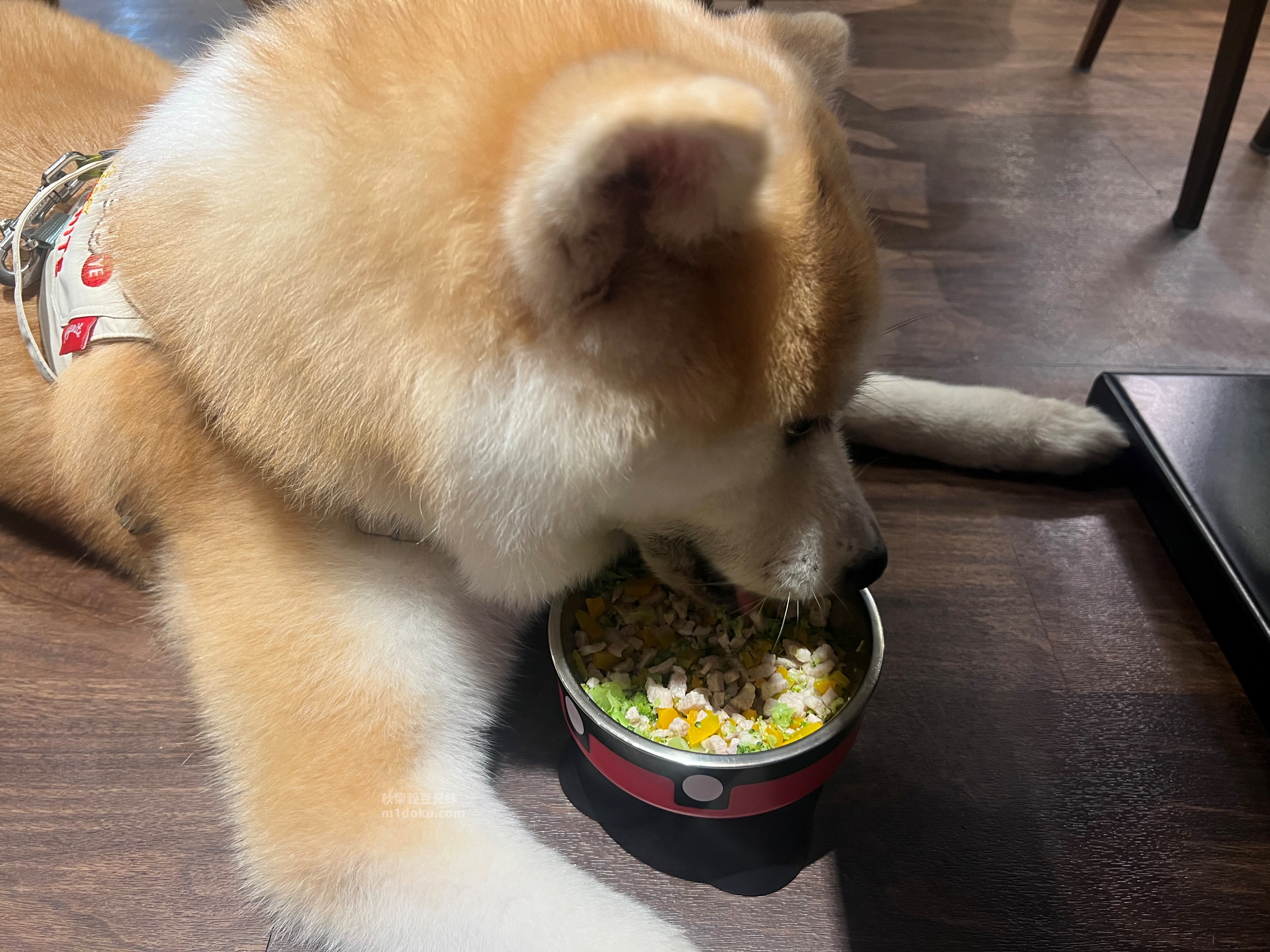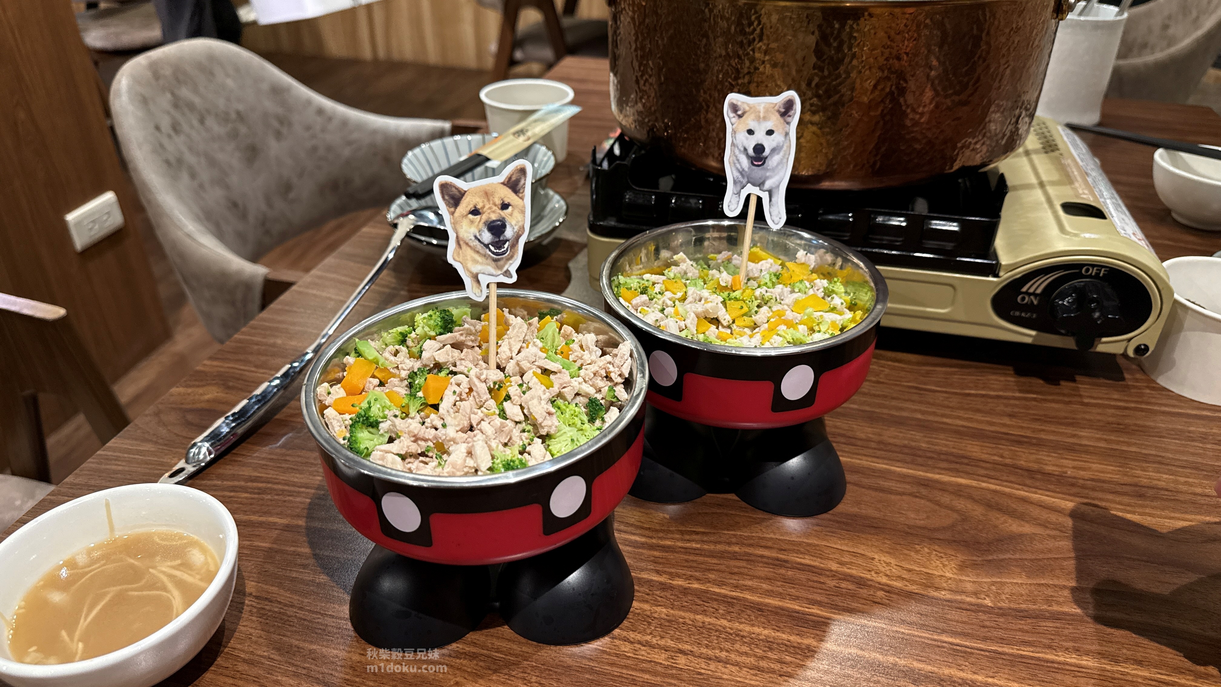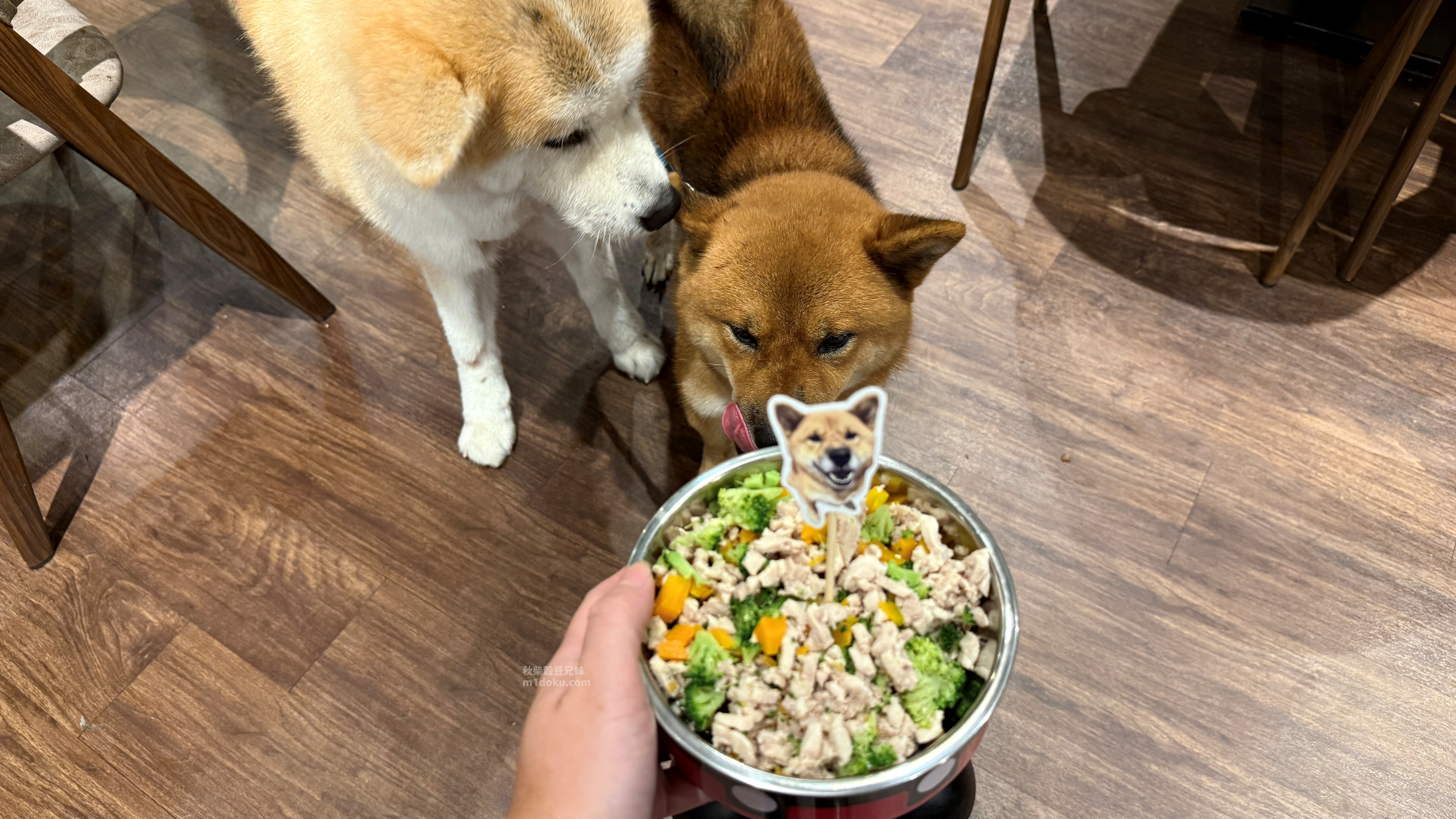 另外不得不提到的是店家對毛孩超級有心!每天沒有販售完的新鮮溫體牛,店家決不浪費,使用低溫慢烘+紫外線殺菌的方式,製作成天然的溫體牛肉乾,分享給所有來店的毛孩們,完全沒加調味,保留了牛肉本身的營養及香氣,讓狗狗能安心吃乾淨又健康!才一送上,連馬麻我整個都被驚呼到,心裡想「哇賽,小狗也太幸福吃太好了吧(大笑)」米豆、米穀就立刻變身超級小吃貨,一直討著要吃,完全被寵壞XD。不只送上毛孩專屬溫體牛肉乾,接著還有寵物餐選擇,店員會先問毛孩是否有過敏的食材,針對毛孩過敏的食材去做調整,整碗滿滿的肉肉加上蔬菜,米豆吃的是雞肉南瓜花椰菜、米穀吃的是豬肉南瓜花椰菜,現場還會製作毛孩專屬的大頭小旗子,整體的小細節都讓我心被融化了,有夠感動的QQ。(寵物餐點內容依店家當日提供為主)