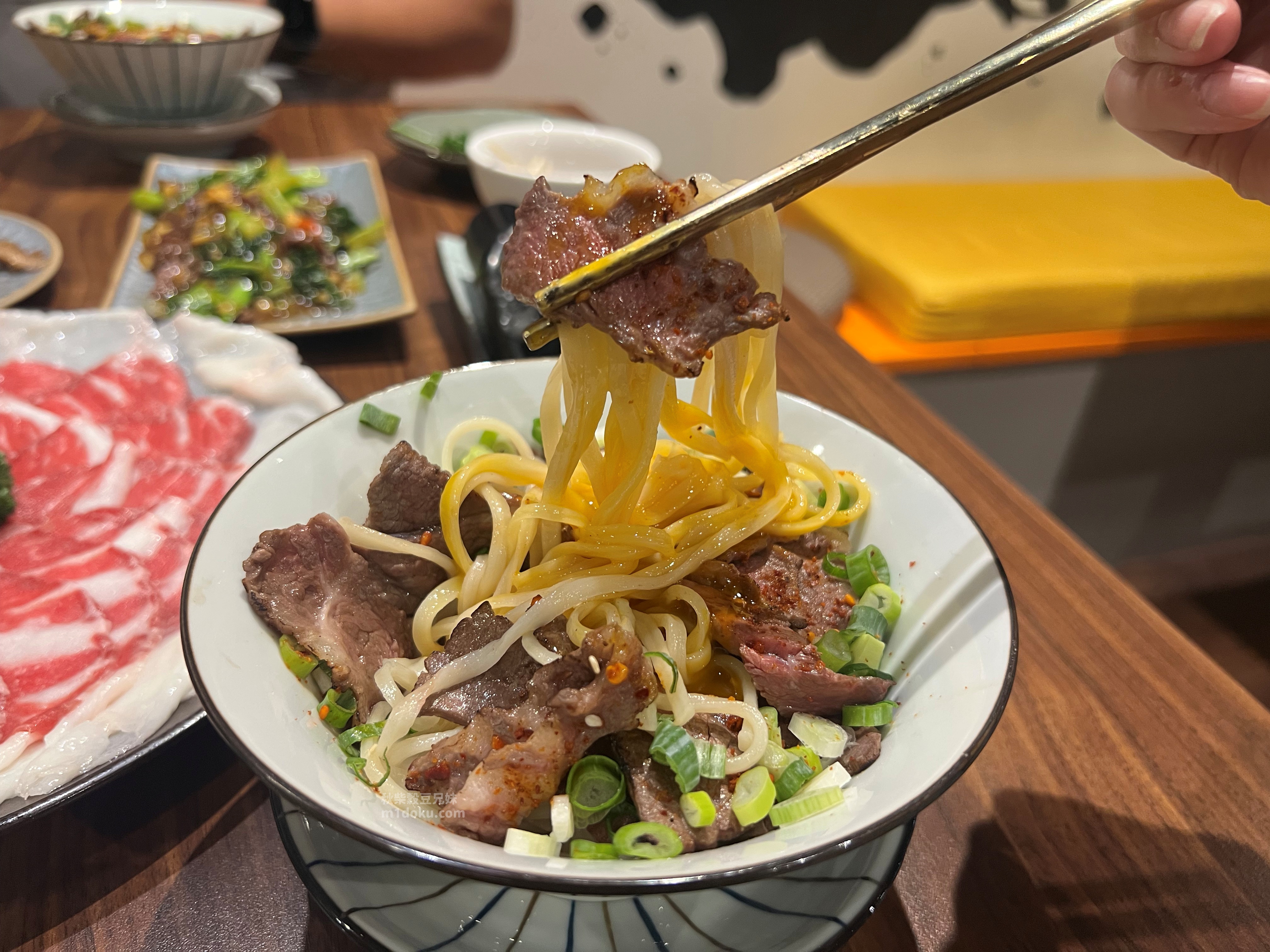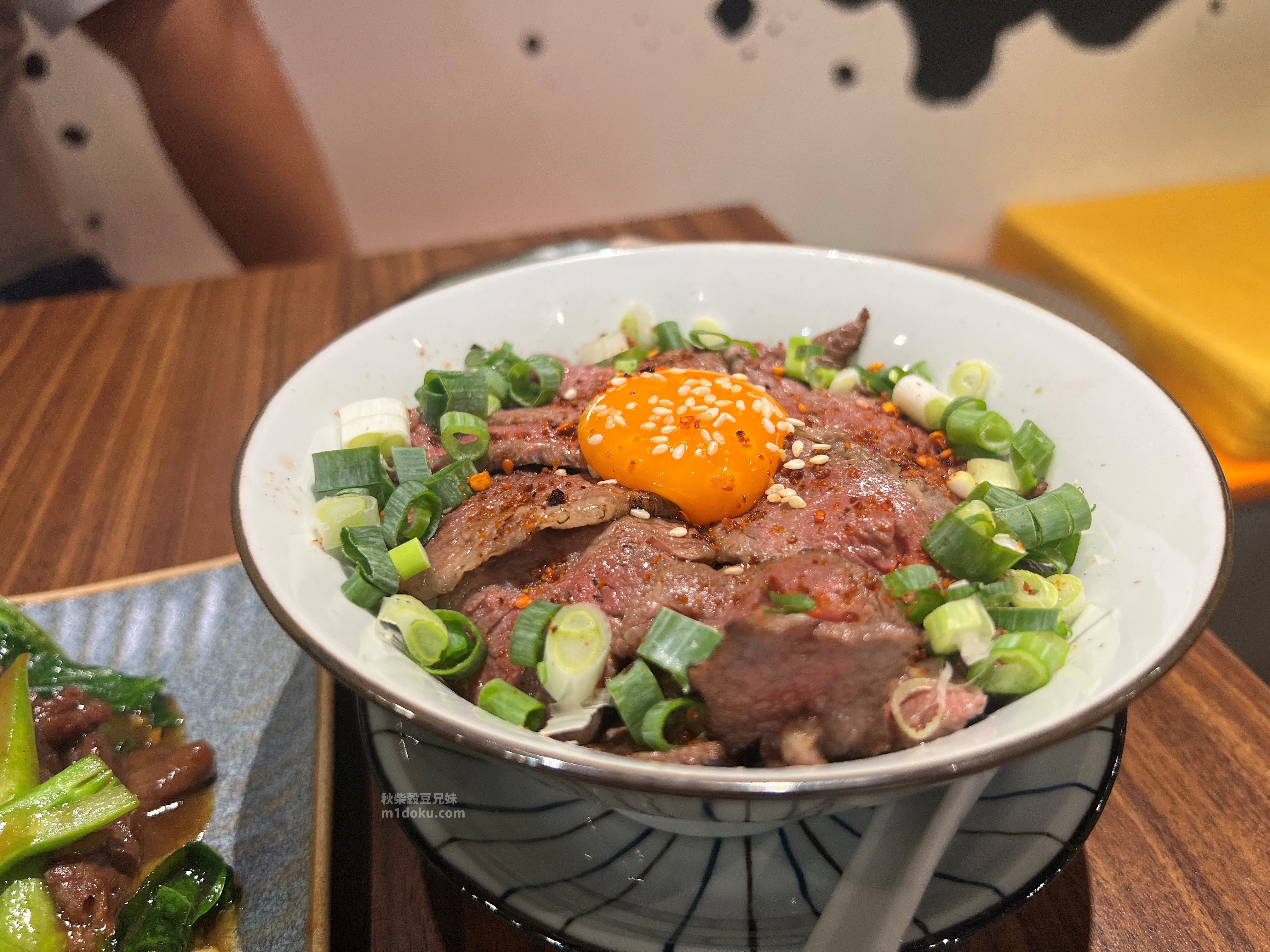 主食的選擇我們升級成撥雲月見牛,他有飯和麵的選項,麵的部分是冷的烏龍麵。炙燒過的牛肉片上撒了一點七味粉,帶有些微的辣,配上流心蛋黃,一戳蛋液就流進飯或麵裡,再混著牛肉拌著入口,香滑又有咬勁,不管吃幾碗都還想續。