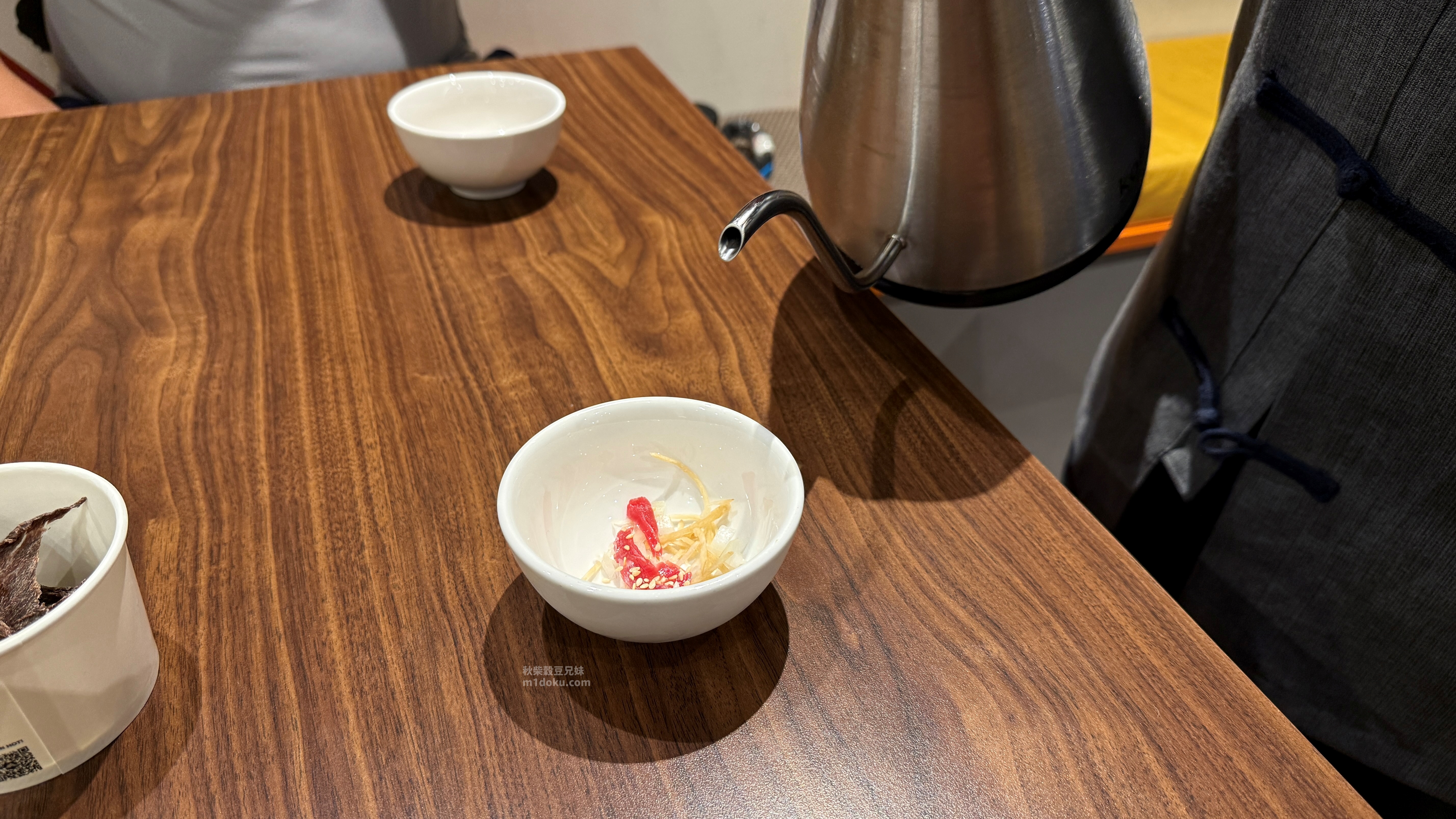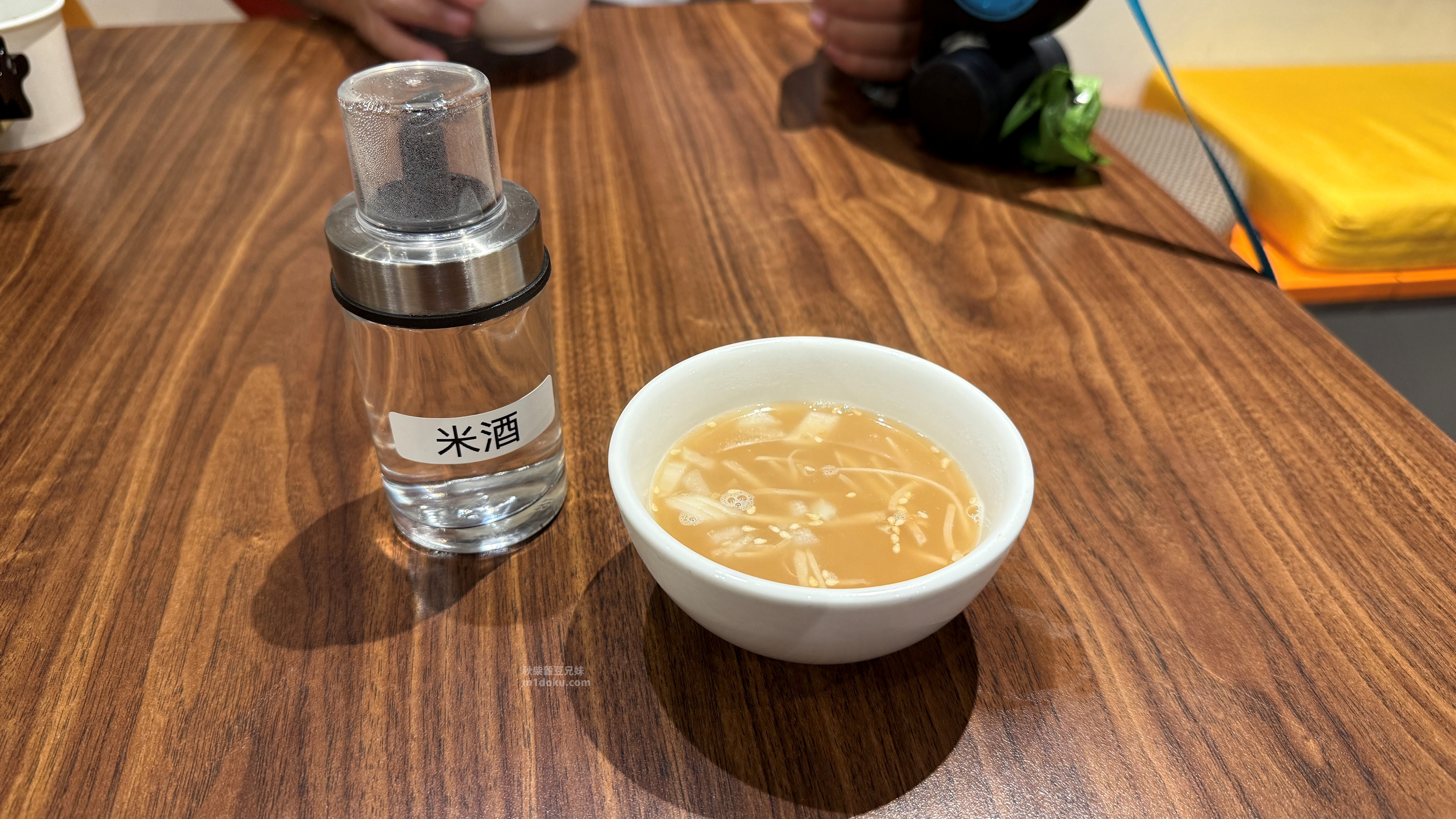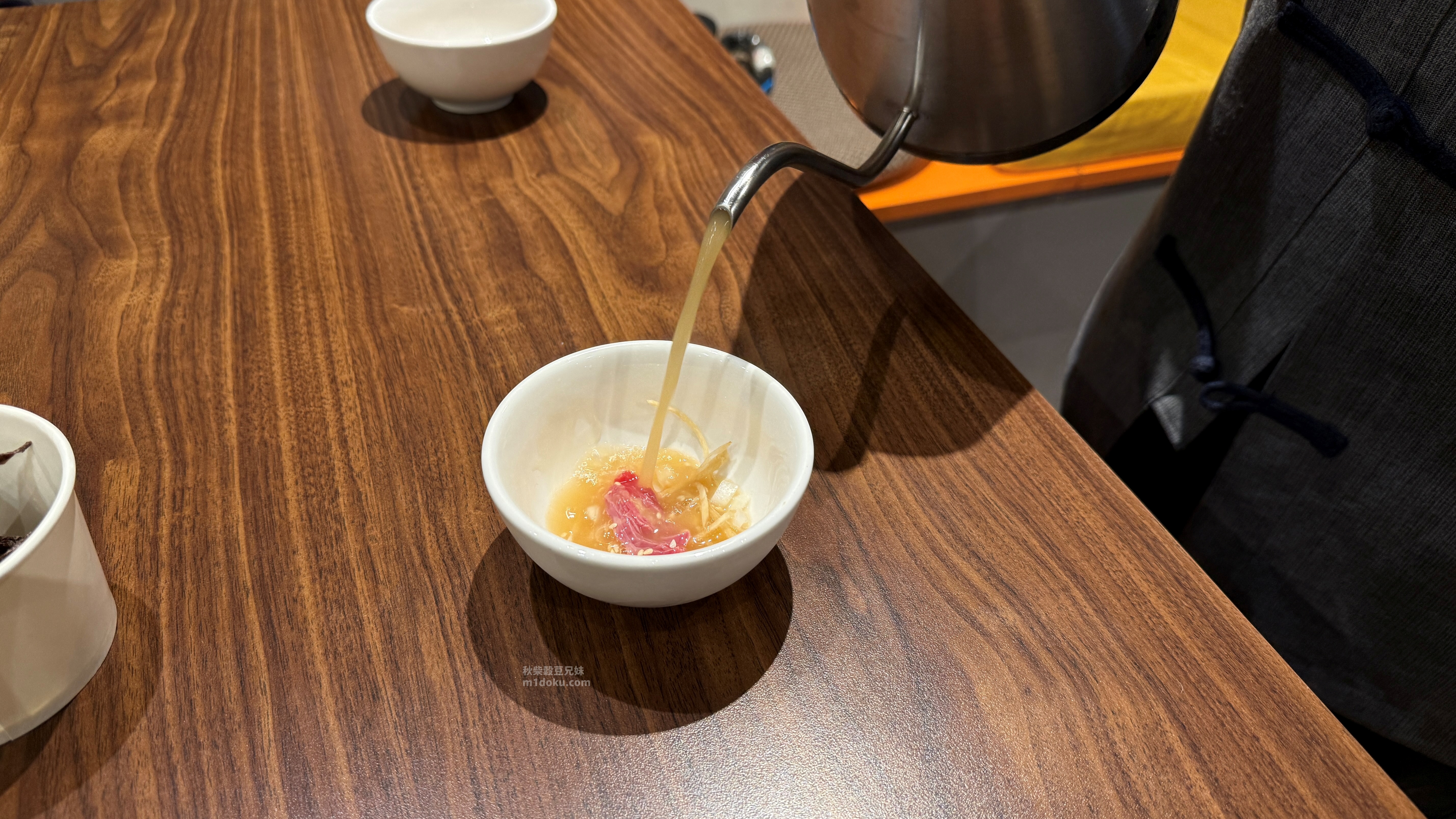 剛坐下沒多久,店員就送上一碗手沖牛肉湯,現場熱沖的畫面再加上牛肉的鮮甜在湯裡散開,首先感受原味的鮮甜口感,還可以添加米酒,提升牛肉的鮮甜味之外還能夠去除腥味,有另一種層次的感覺。喝起來整個心和胃都暖起來了,也瞬間開胃了(笑)