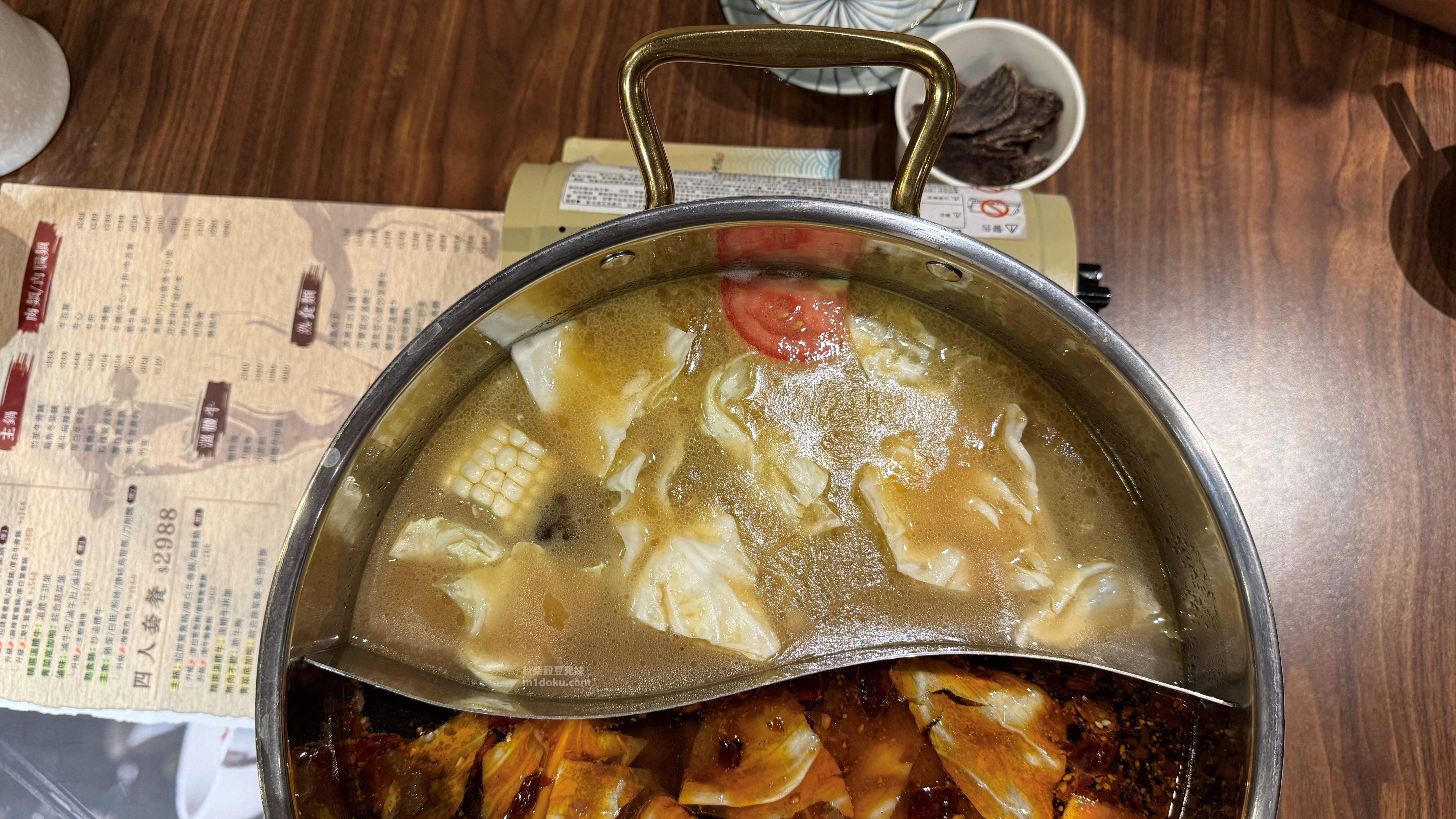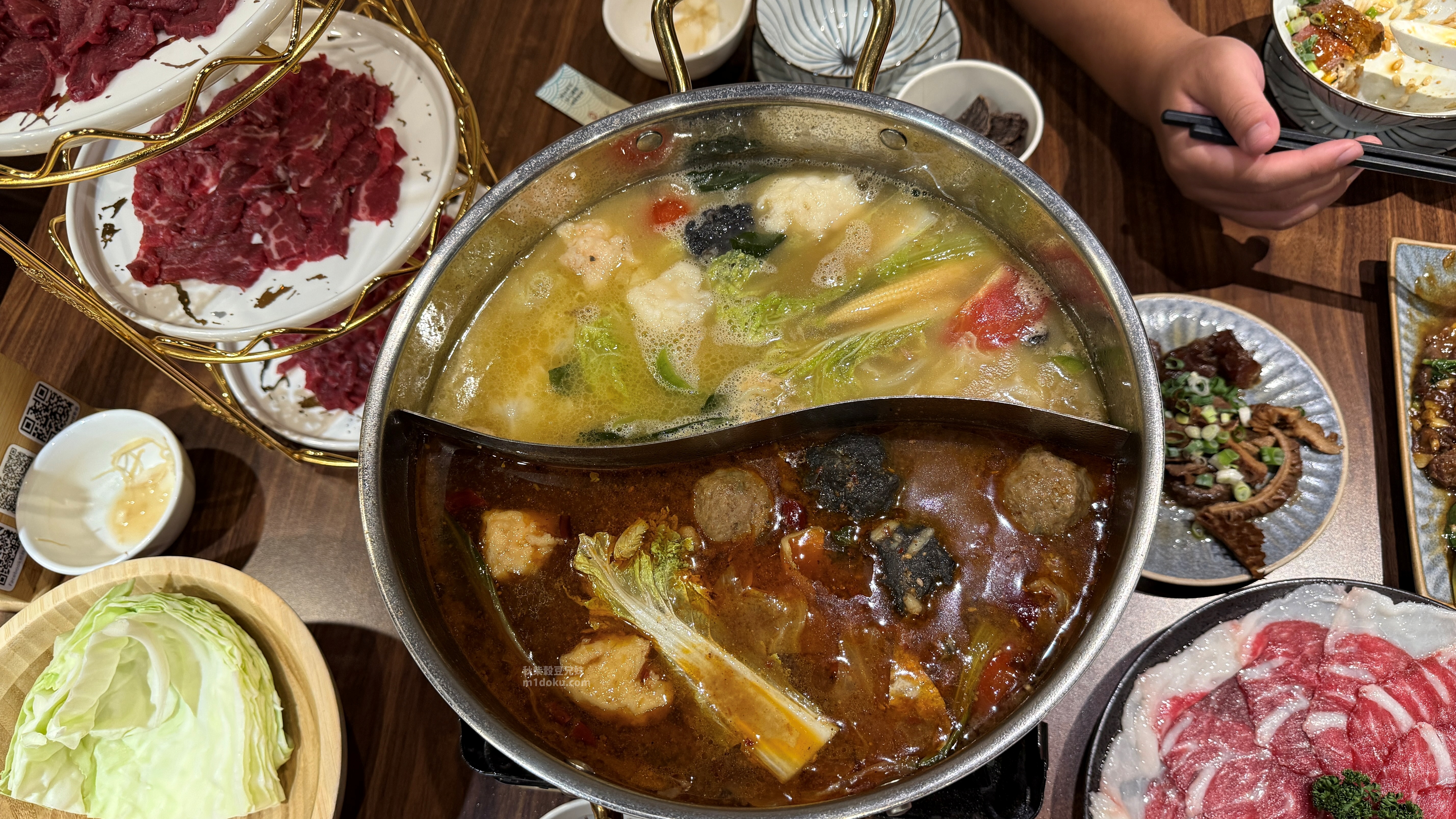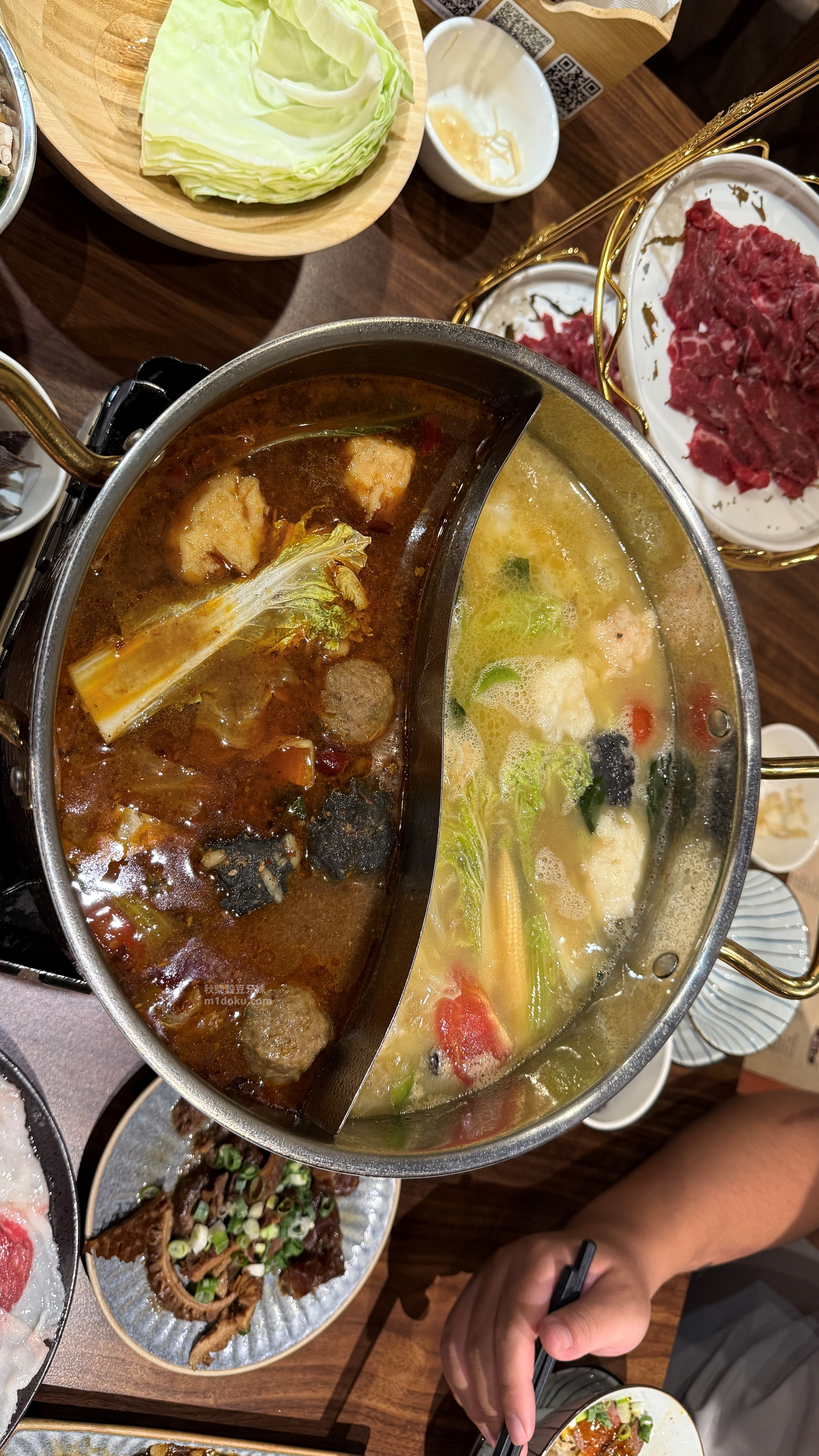 輪到我們人類的部分——我們點的是雙人套餐,先上一道脆牛胸,白色的部分原本以為是肥肉肥油之類的,沒有想到居然是牛肉的筋膜耶!口感相當特別軟嫩,又香又有嚼勁。我們選擇的是鴛鴦鍋,湯底是麻辣和厚白牛骨,麻辣鍋香氣十足,不會到很辣,連我不吃辣的人都能夠接受。厚白牛骨鍋的湯底就是剛剛喝的手沖牛肉湯,味道相當濃郁,是使用牛骨及蔬果熬煮而成的相當清香,果然是招牌湯底,讓人都想點白飯直接泡湯吃了(喂XD)