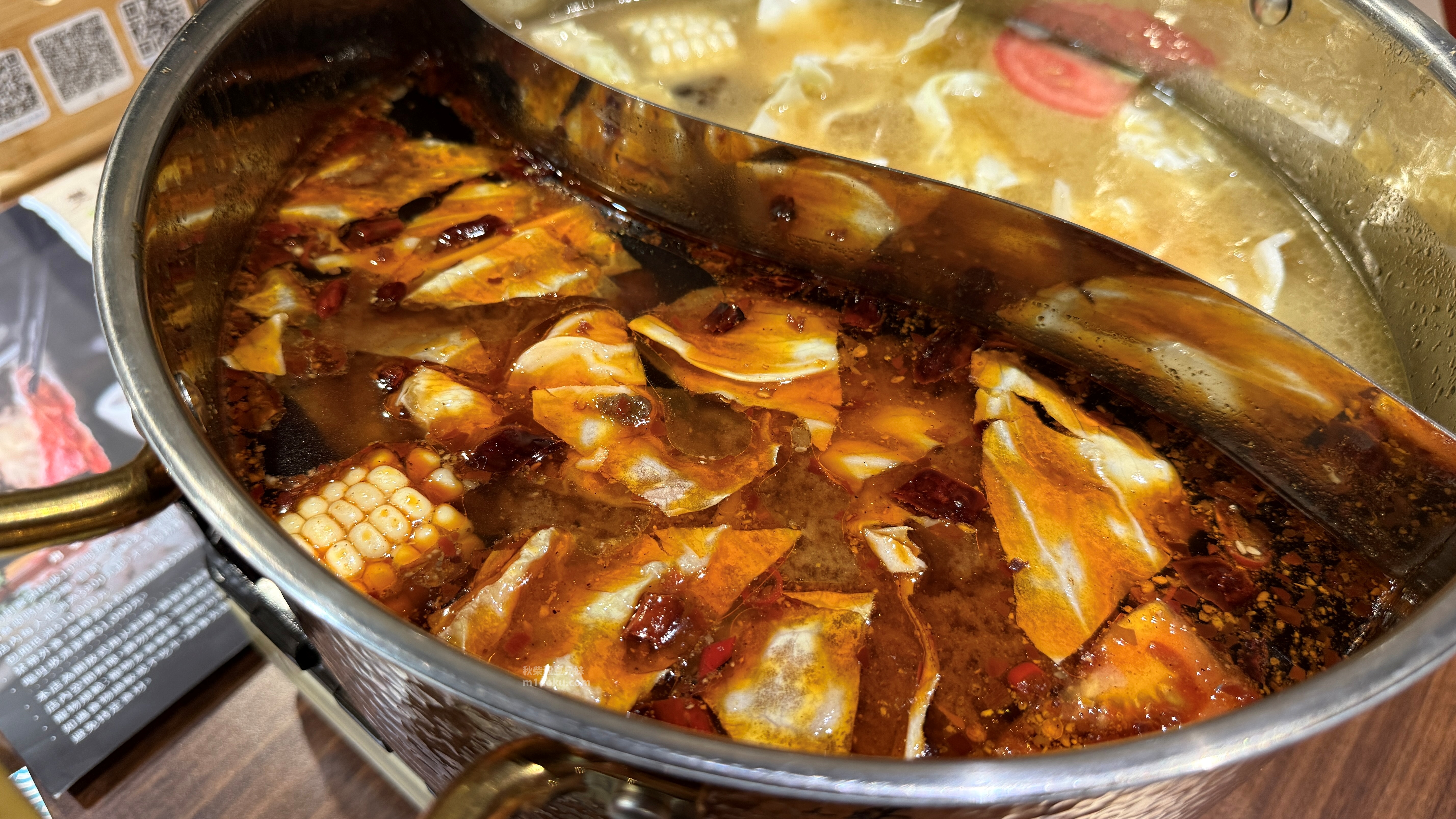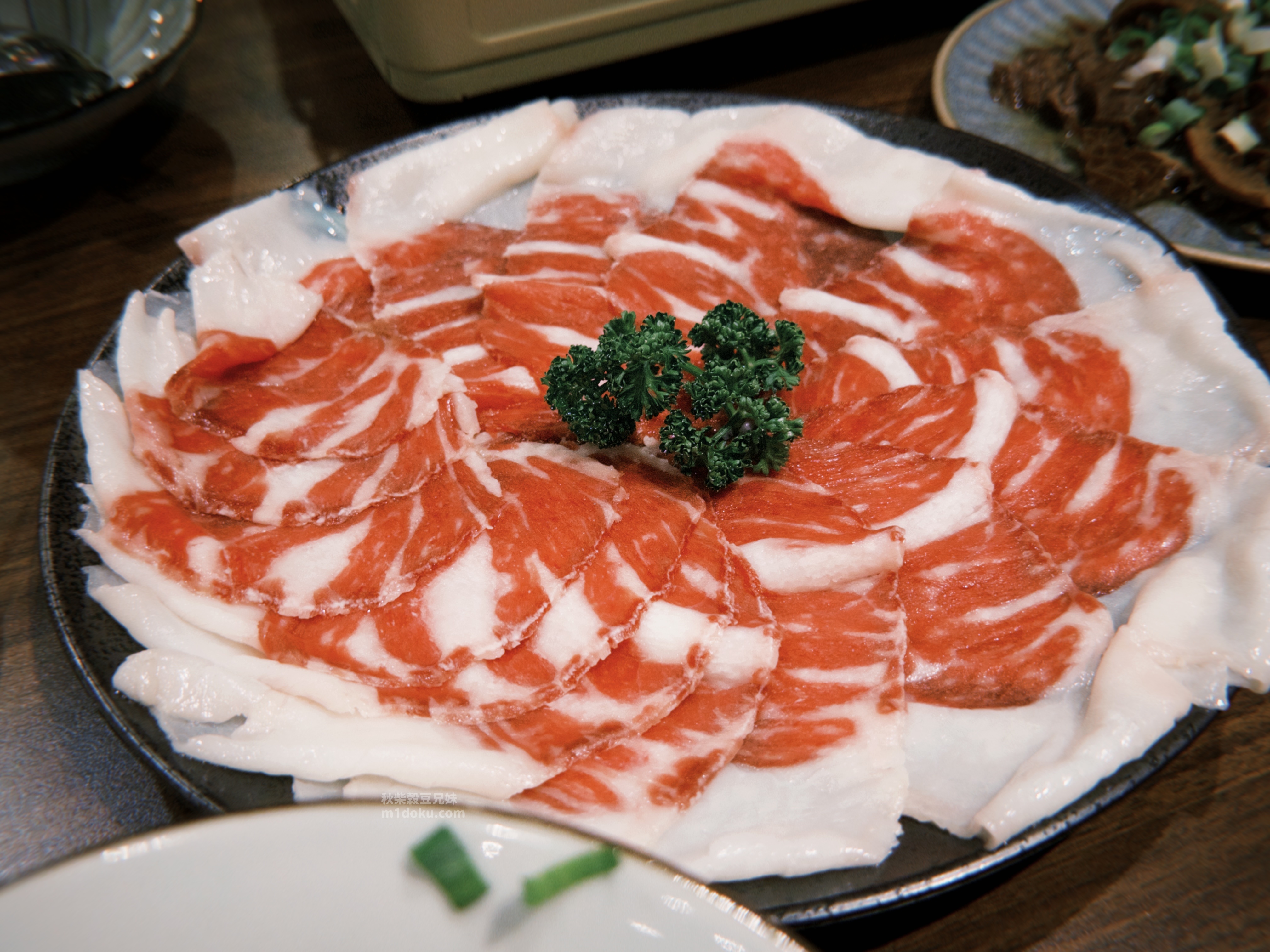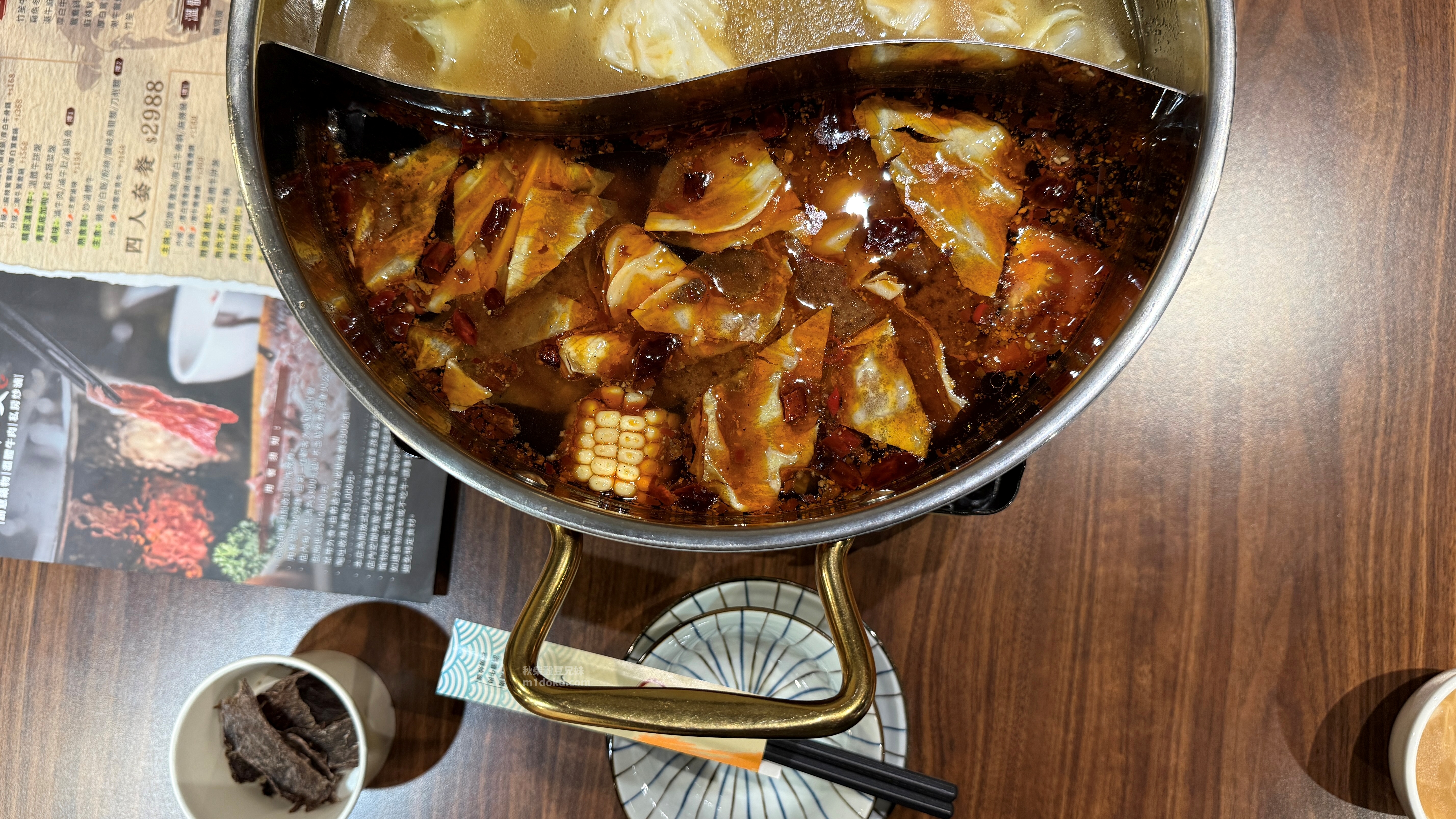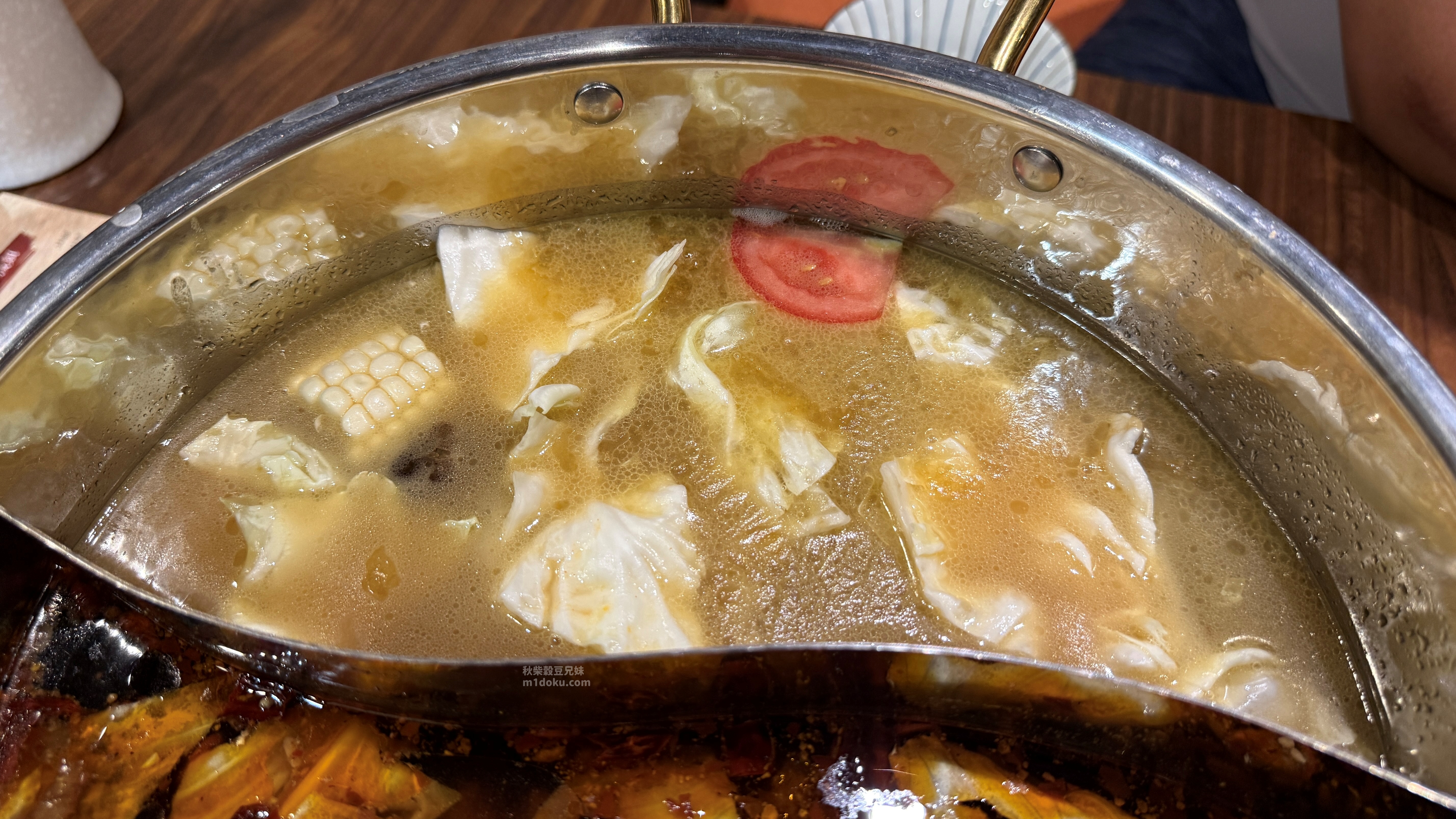 輪到我們人類的部分——我們點的是雙人套餐,先上一道脆牛胸,白色的部分原本以為是肥肉肥油之類的,沒有想到居然是牛肉的筋膜耶!口感相當特別軟嫩,又香又有嚼勁。我們選擇的是鴛鴦鍋,湯底是麻辣和厚白牛骨,麻辣鍋香氣十足,不會到很辣,連我不吃辣的人都能夠接受。厚白牛骨鍋的湯底就是剛剛喝的手沖牛肉湯,味道相當濃郁,是使用牛骨及蔬果熬煮而成的相當清香,果然是招牌湯底,讓人都想點白飯直接泡湯吃了(喂XD)
