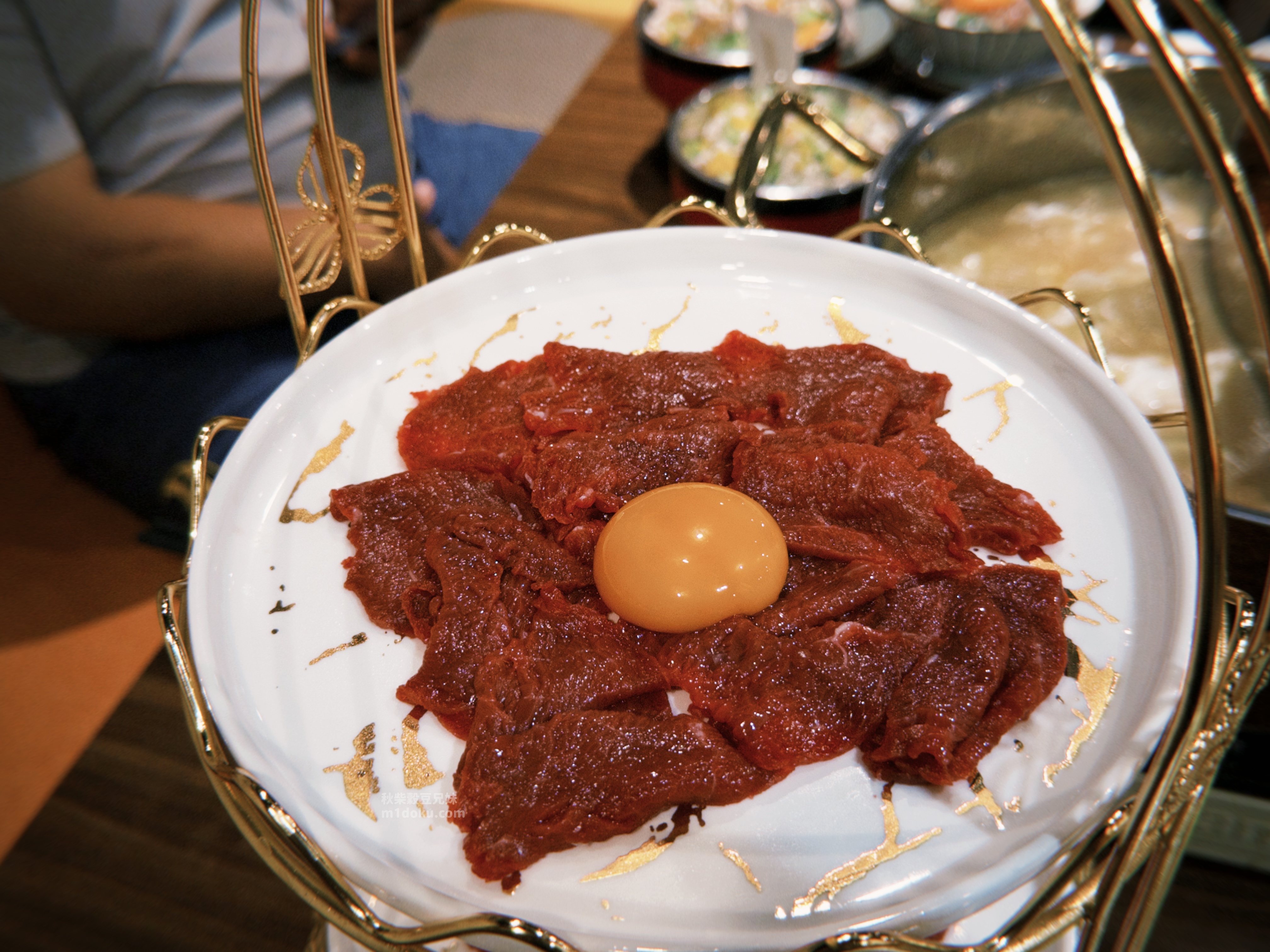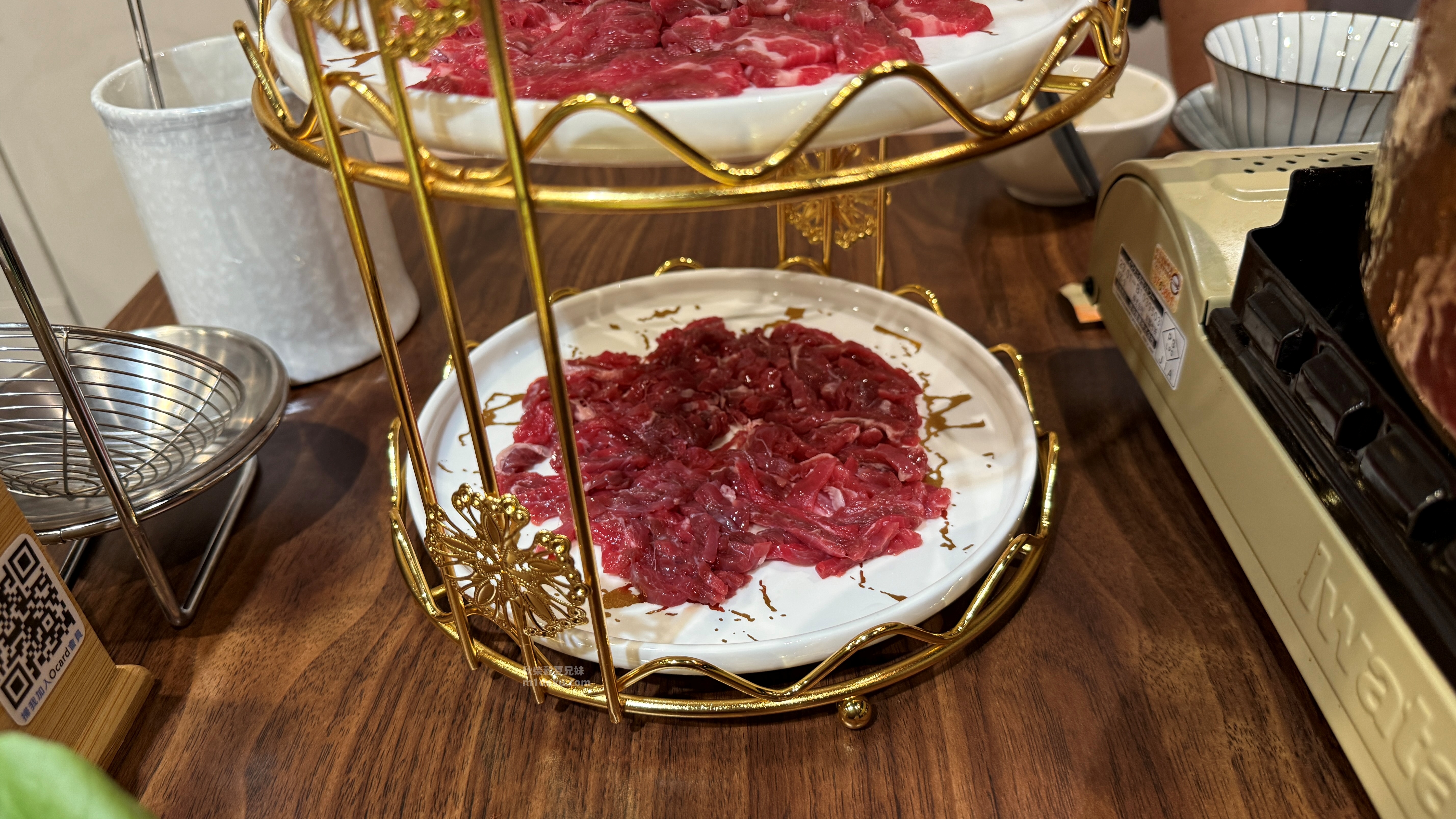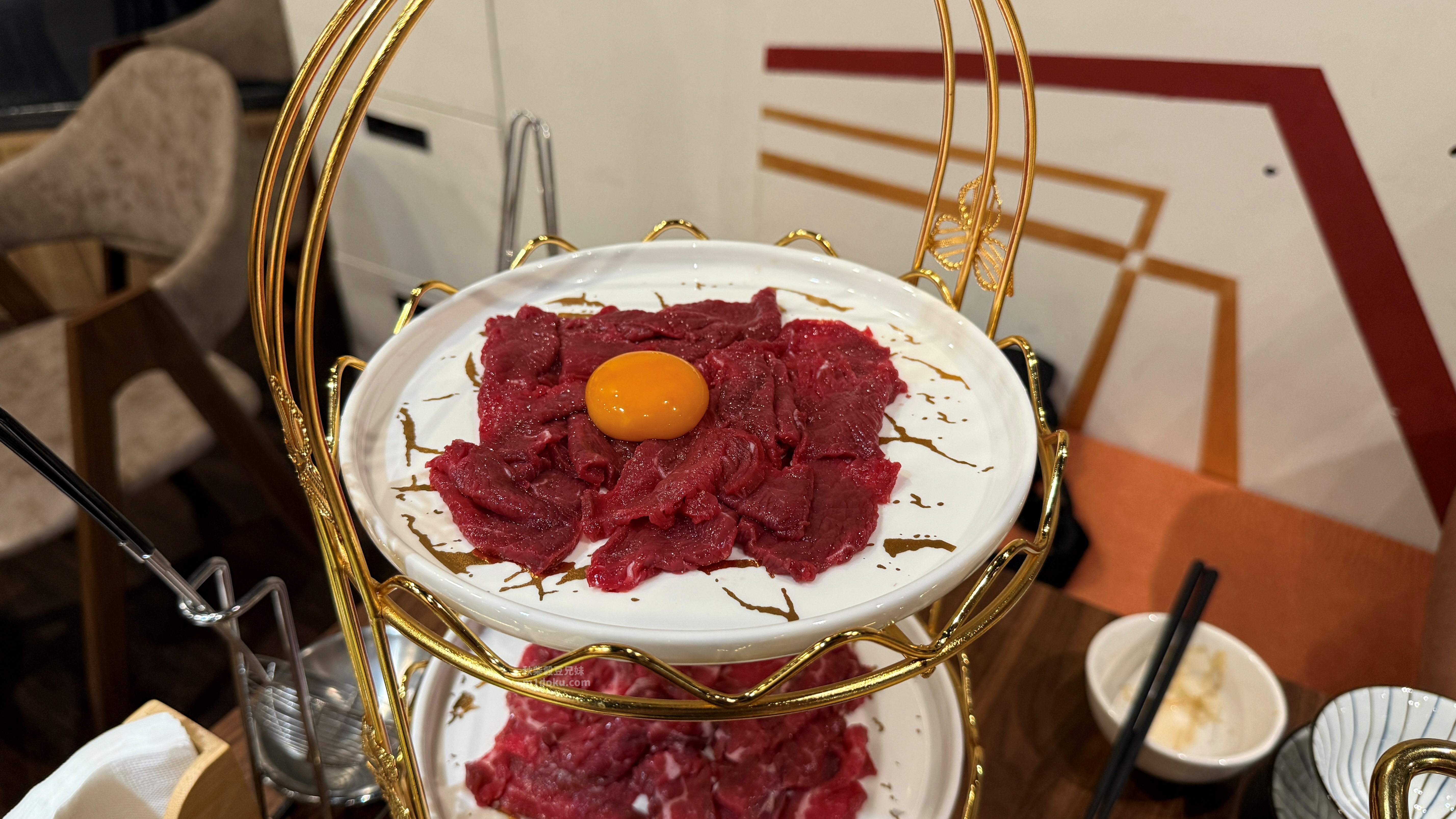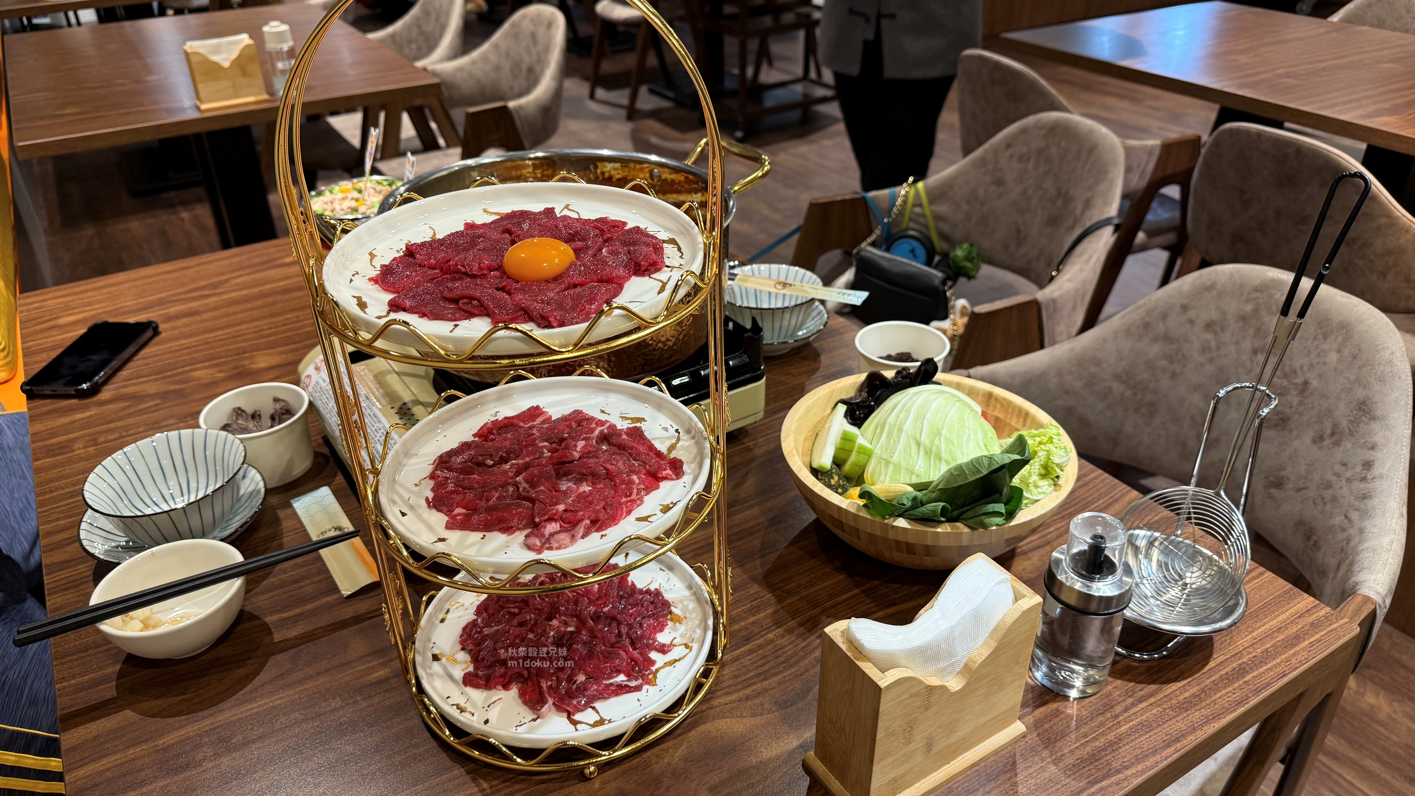 溫體牛拼盤登場的相當華麗,三層的溫體牛亮麗登場!橫膈膜、牛腱心、小里肌──店員還貼心介紹油花比例,怎麼搭配蛋黃更滑嫩,吃下去真的覺得自己幸福爆表。