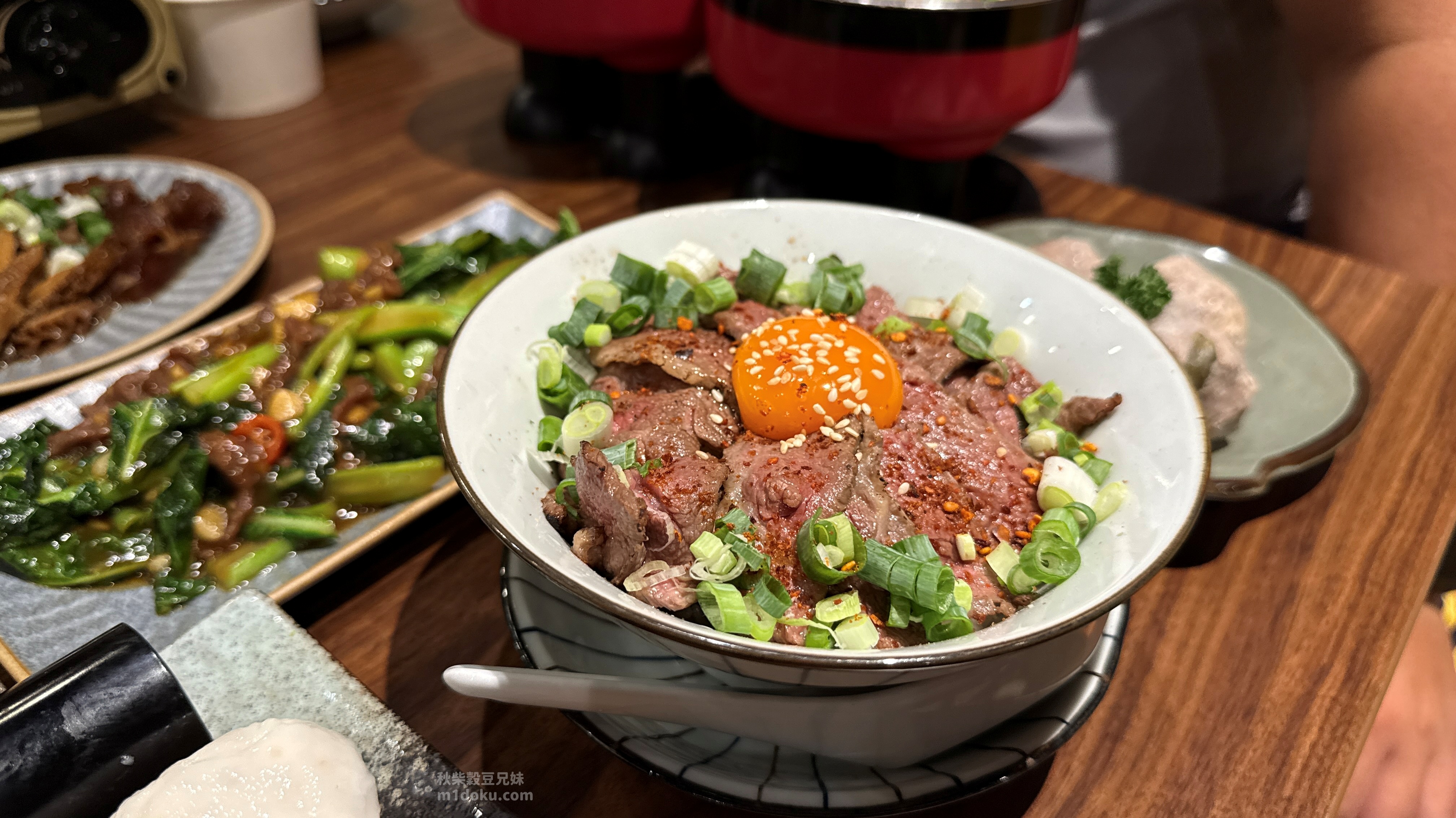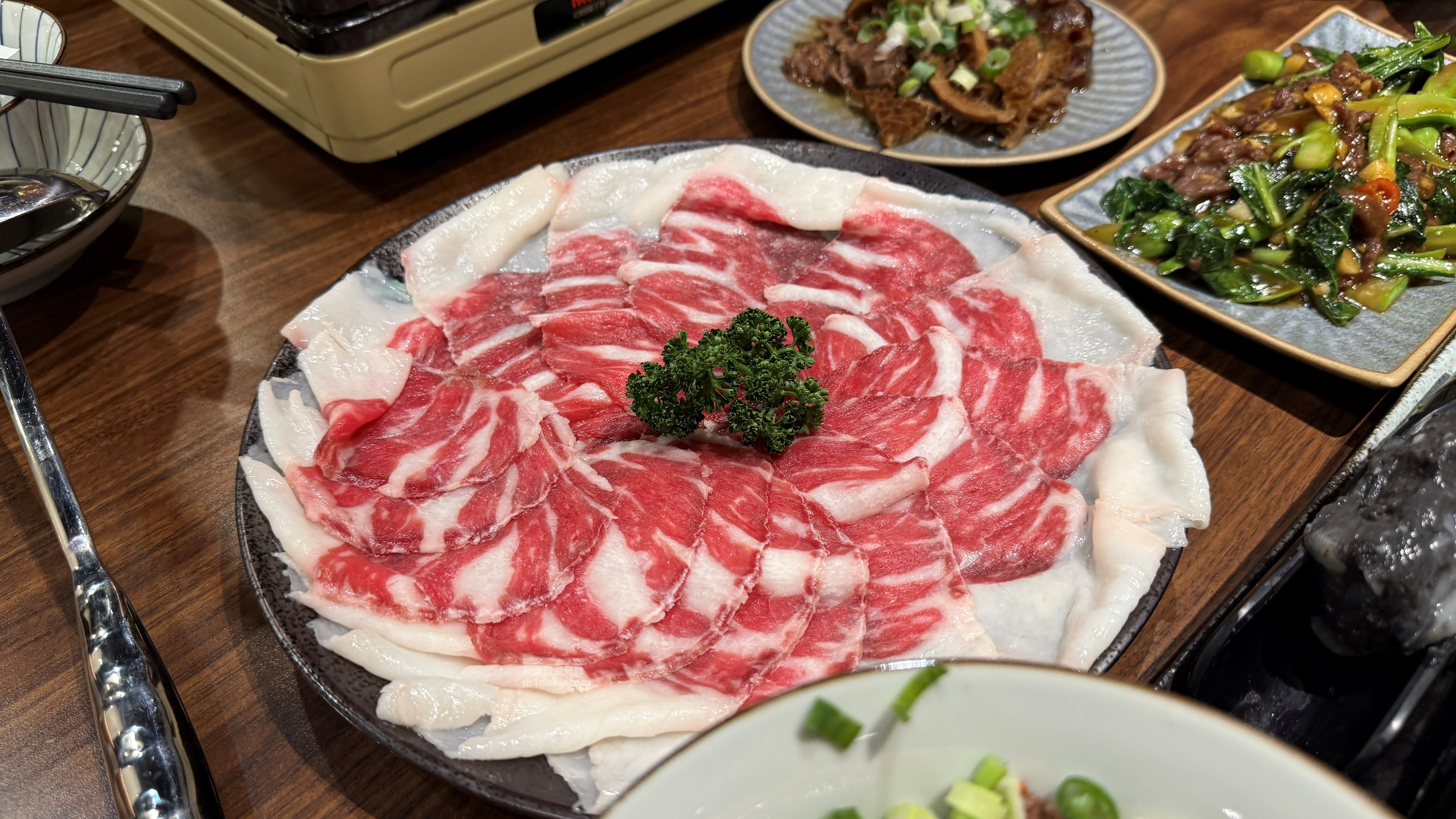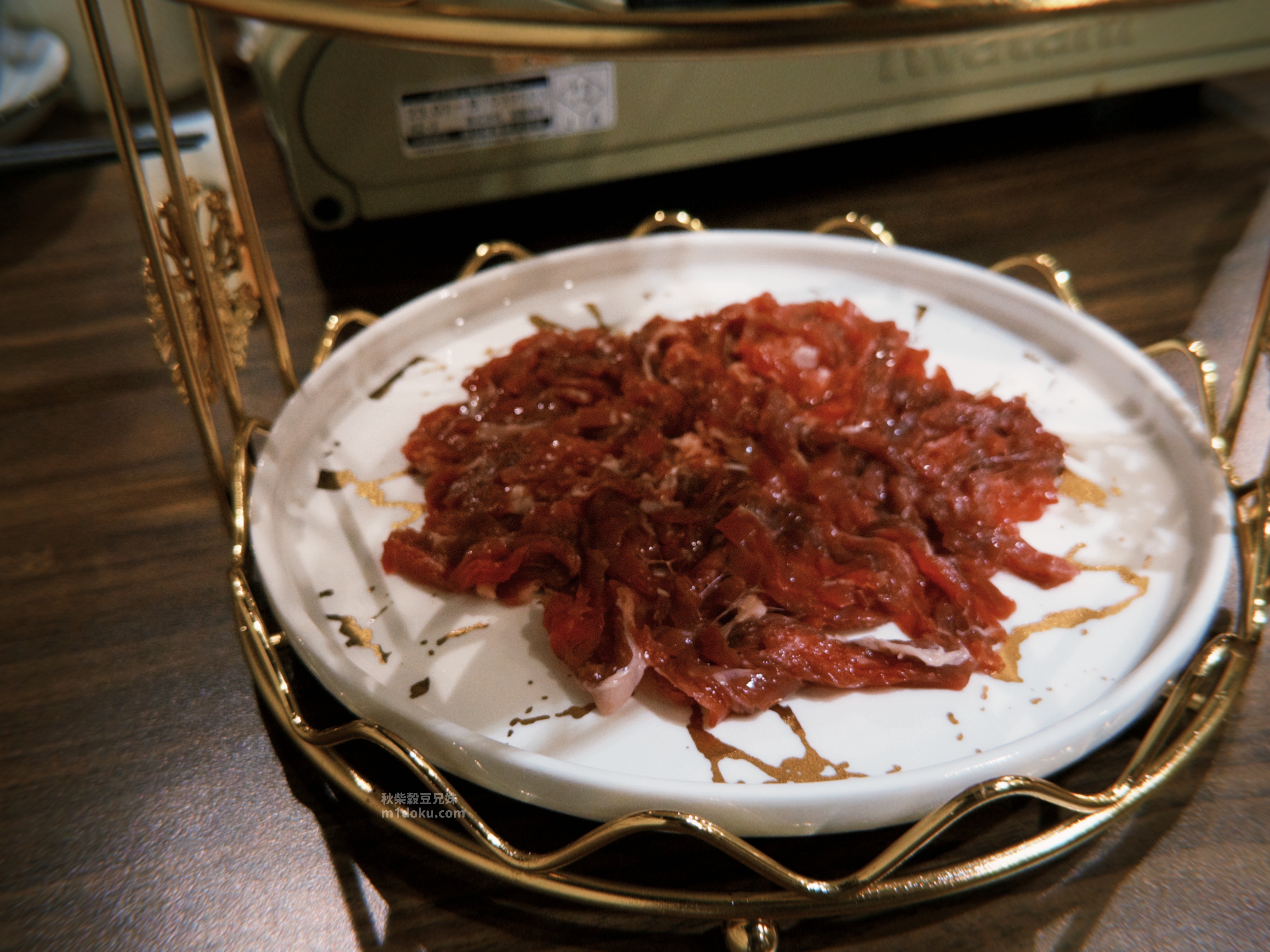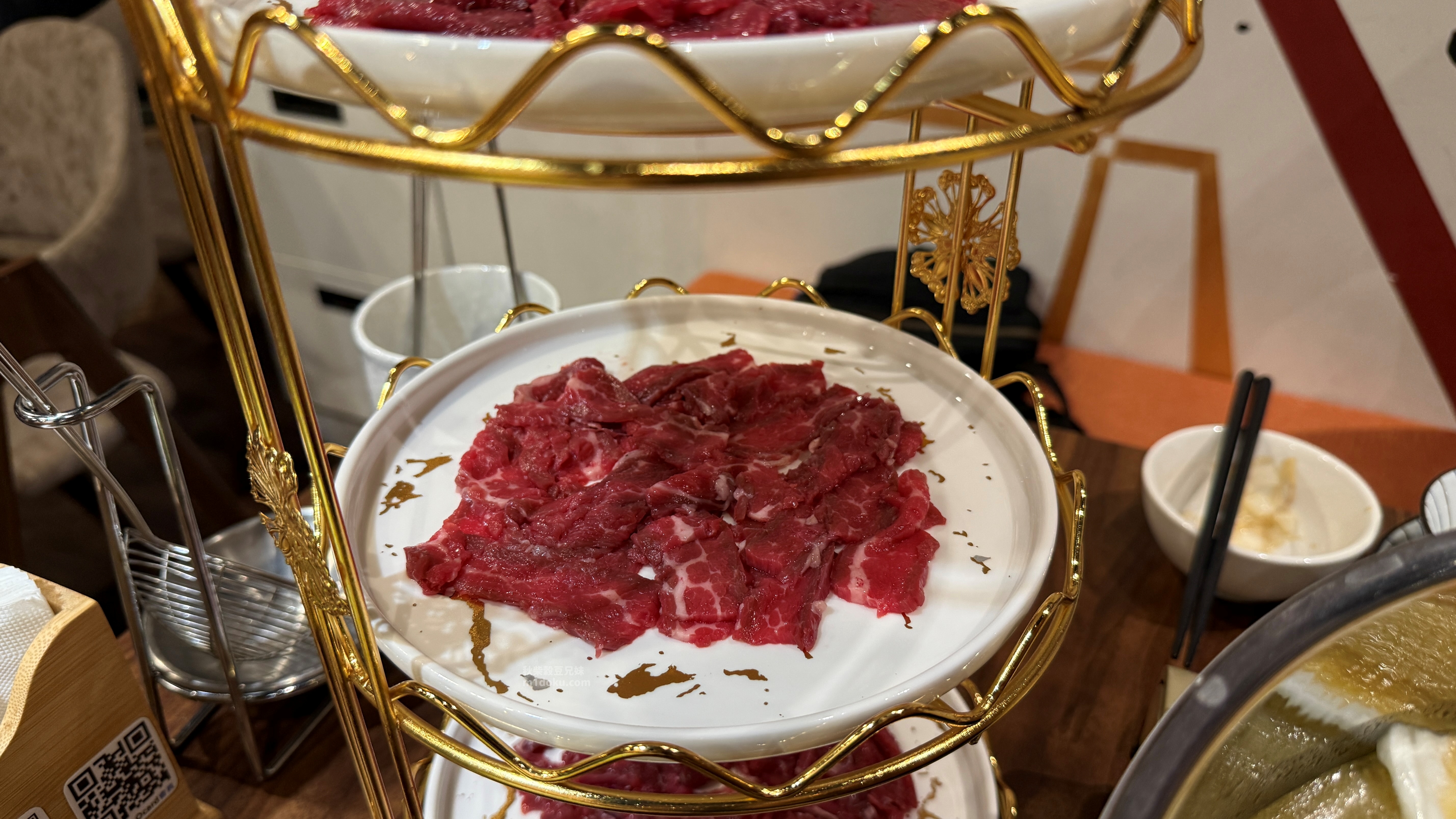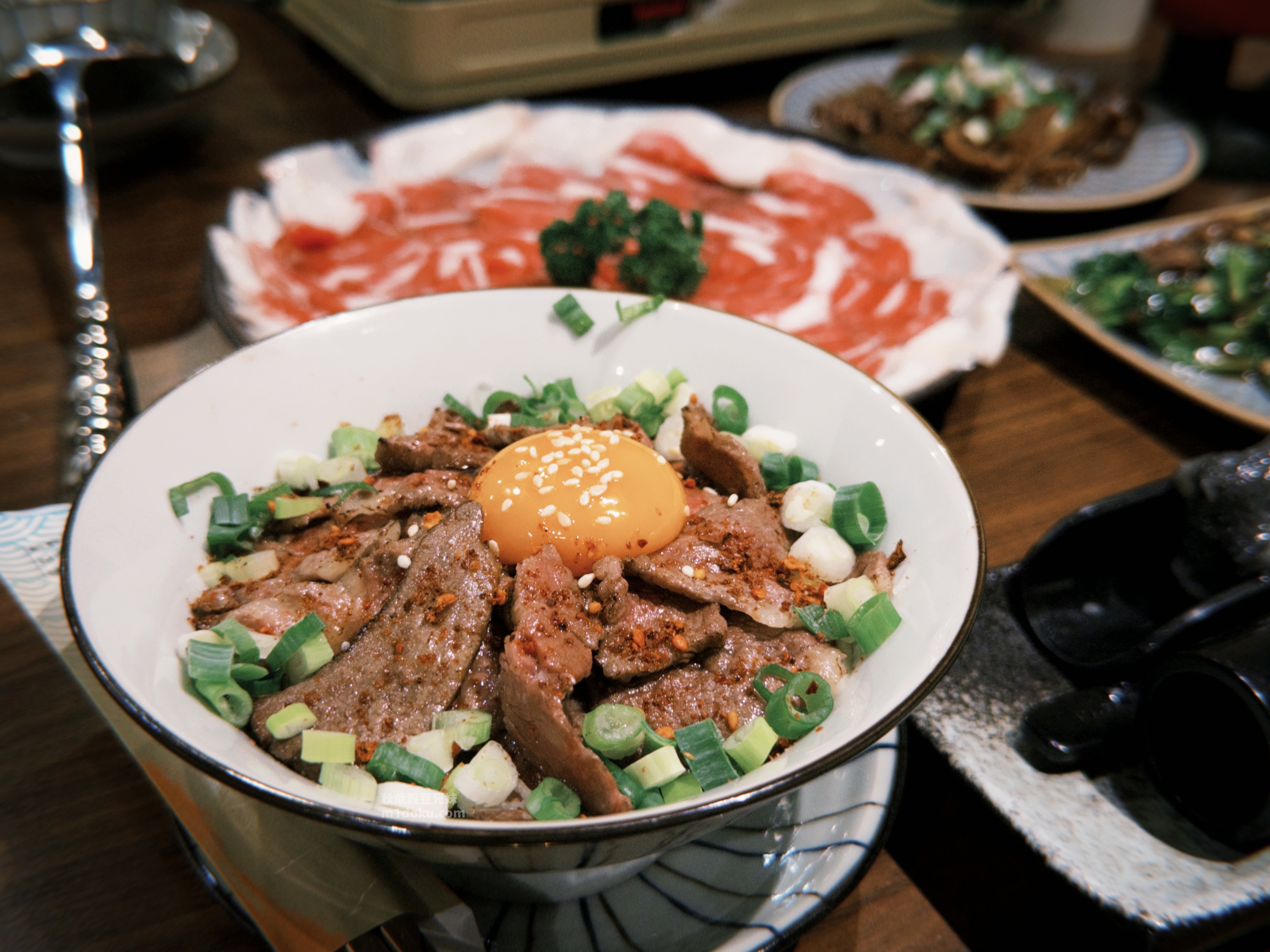 溫體牛拼盤登場的相當華麗,三層的溫體牛亮麗登場!橫膈膜、牛腱心、小里肌──店員還貼心介紹油花比例,怎麼搭配蛋黃更滑嫩,吃下去真的覺得自己幸福爆表。