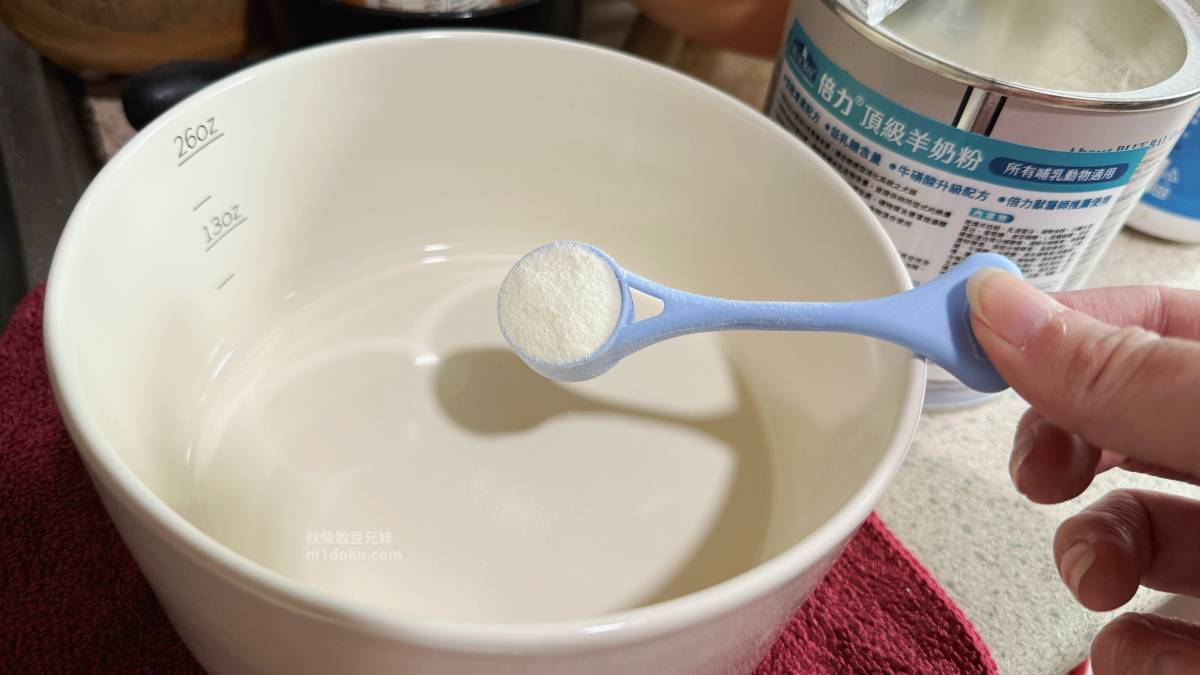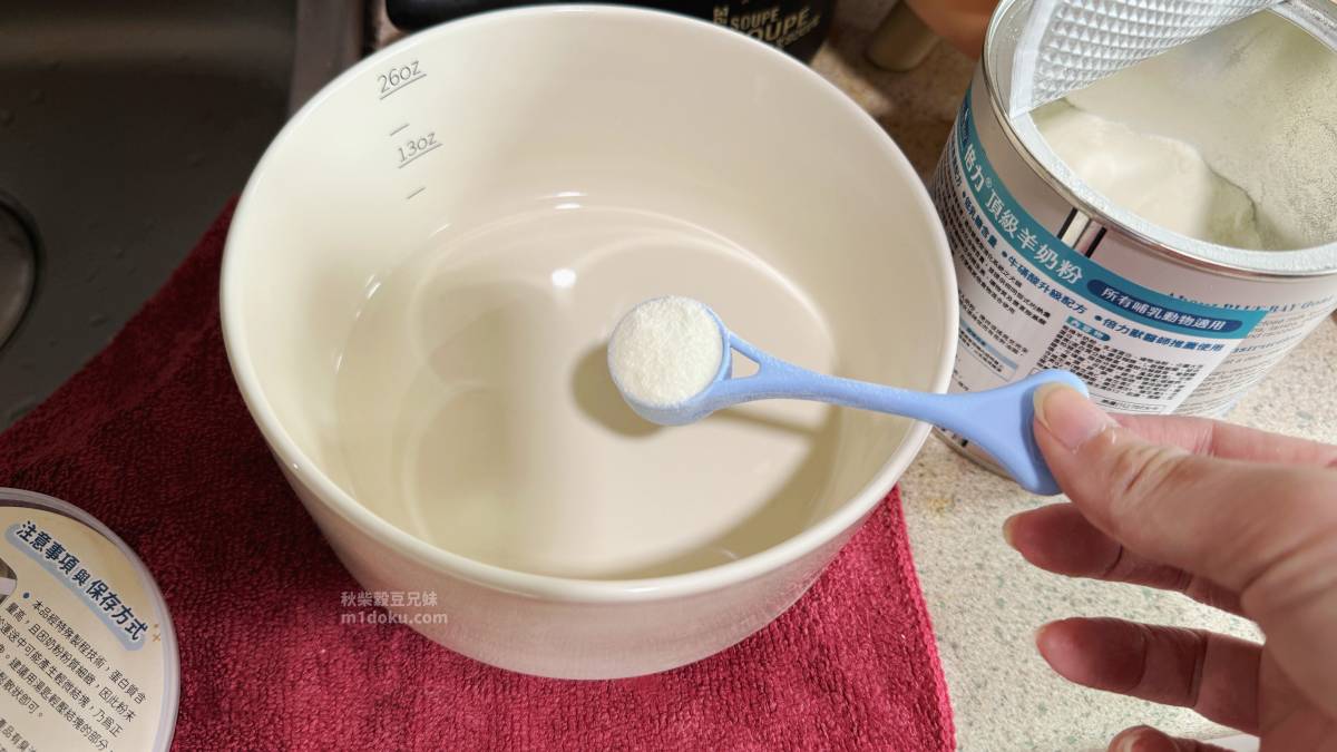 才剛打開包裝米豆就聞到是ㄋㄟㄋㄟ的味道,馬上就衝來旁邊等待,我都是用沖泡的方式讓米豆喝,粉質確實相當細膩而且羊奶味很香,很像我們小時候吃到的嘉南羊奶羊乳片的那種香味,連我都好想要喝喝看哦(米豆:媽媽不要跟我搶!)沖泡完之後一放下碗沒多久,米豆馬上就湊過來開始喝了起來,看他喝的相當開心,媽媽我也覺得很高興!