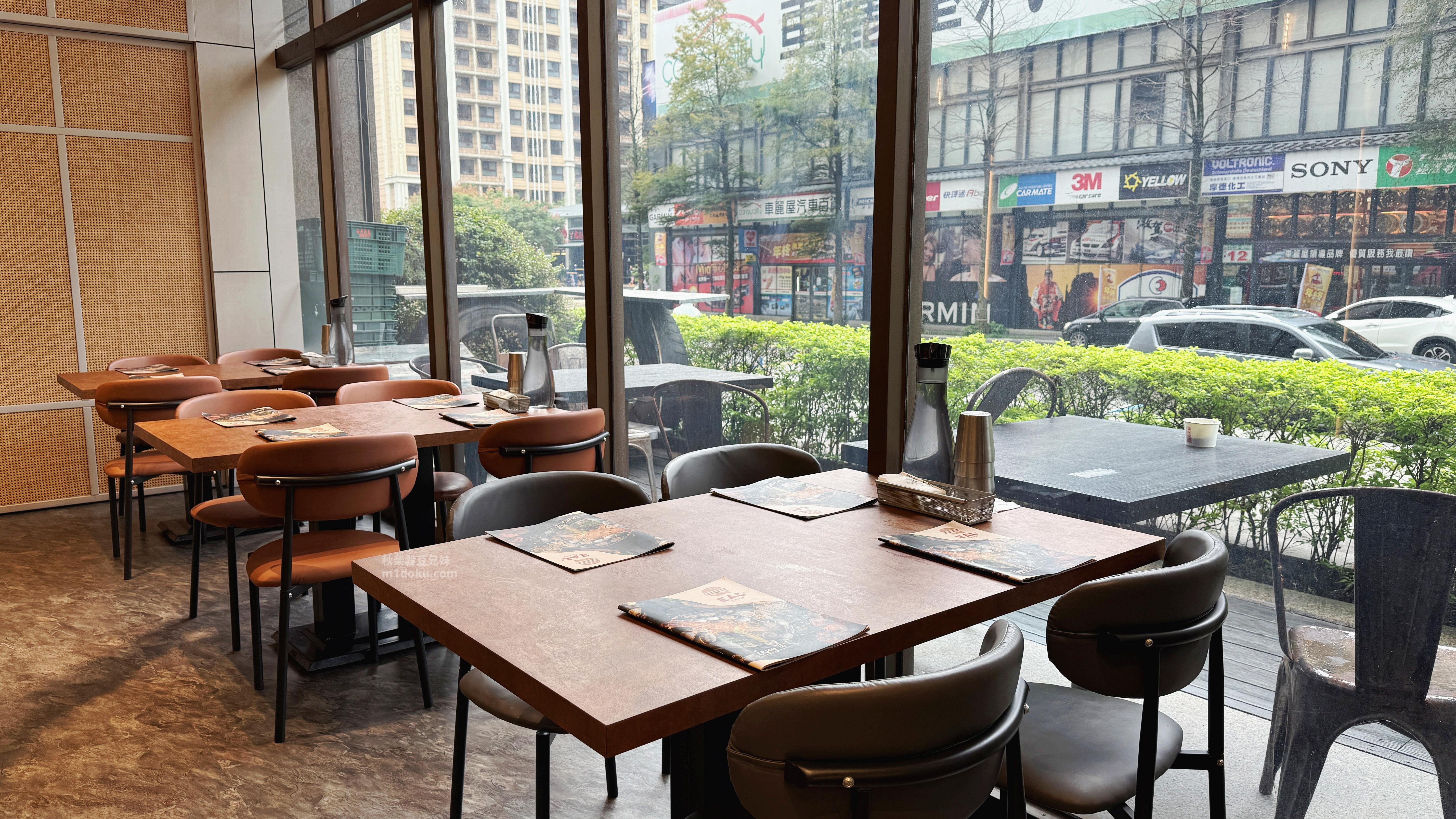 Eat enjoy意享美式廚房 林口三井店共有兩層樓,還有一間獨立包廂,可容納十人座位,無論包場或是辦活動都相當適合呢!如有需要的話詳細都可以詢問店家。一樓空間相當寬敞,挑高的設計搭配大面落地窗,整體採光相當好!店內對毛孩的接納氛圍很自然,不會有那種「被特別對待」的拘謹。我們坐在一樓靠角落的位置,比較不會有人在我們旁邊來回走動,對於毛孩來說能夠相當放心、安心的趴在地上休息。