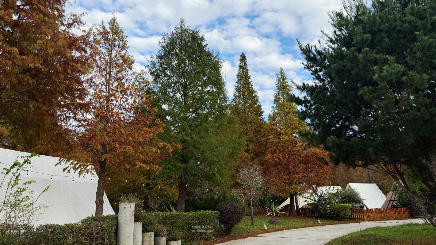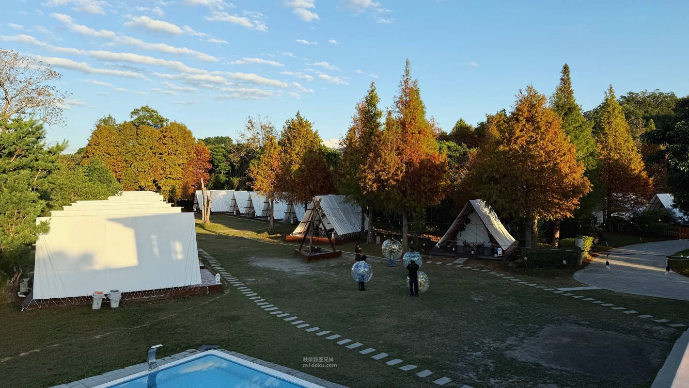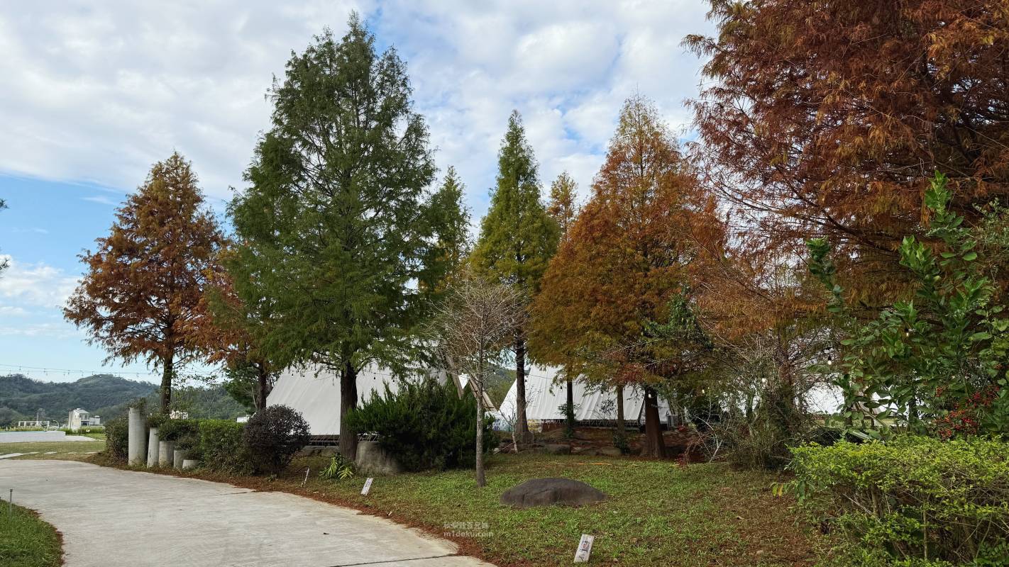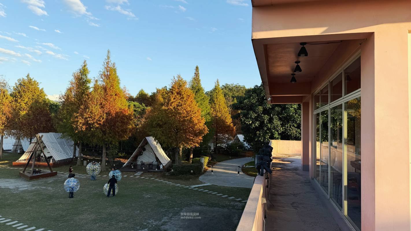 叢林開始Glamping-苗栗店交通算是相當便利,距離頭屋交流道只需要約5分鐘的車程!整個營區相當漂亮,非常有度假氛圍,落羽松剛好盛開非常美麗,園區內有位置可以免費停車。整個營區不算大,餐廳及櫃檯是一棟兩層樓的橘紅色建築物,除了是餐廳和櫃檯之外,還有吧台哦!二樓是多功能活動中心,有著KTV可以唱歌以及電動麻將桌可以使用。整個園區只有兩處吸菸區,有吸菸的人要注意哦!建築物前有一座網美戲水池,往遠處看能夠一眼盡收山嵐美景,相當舒適!