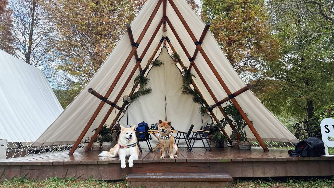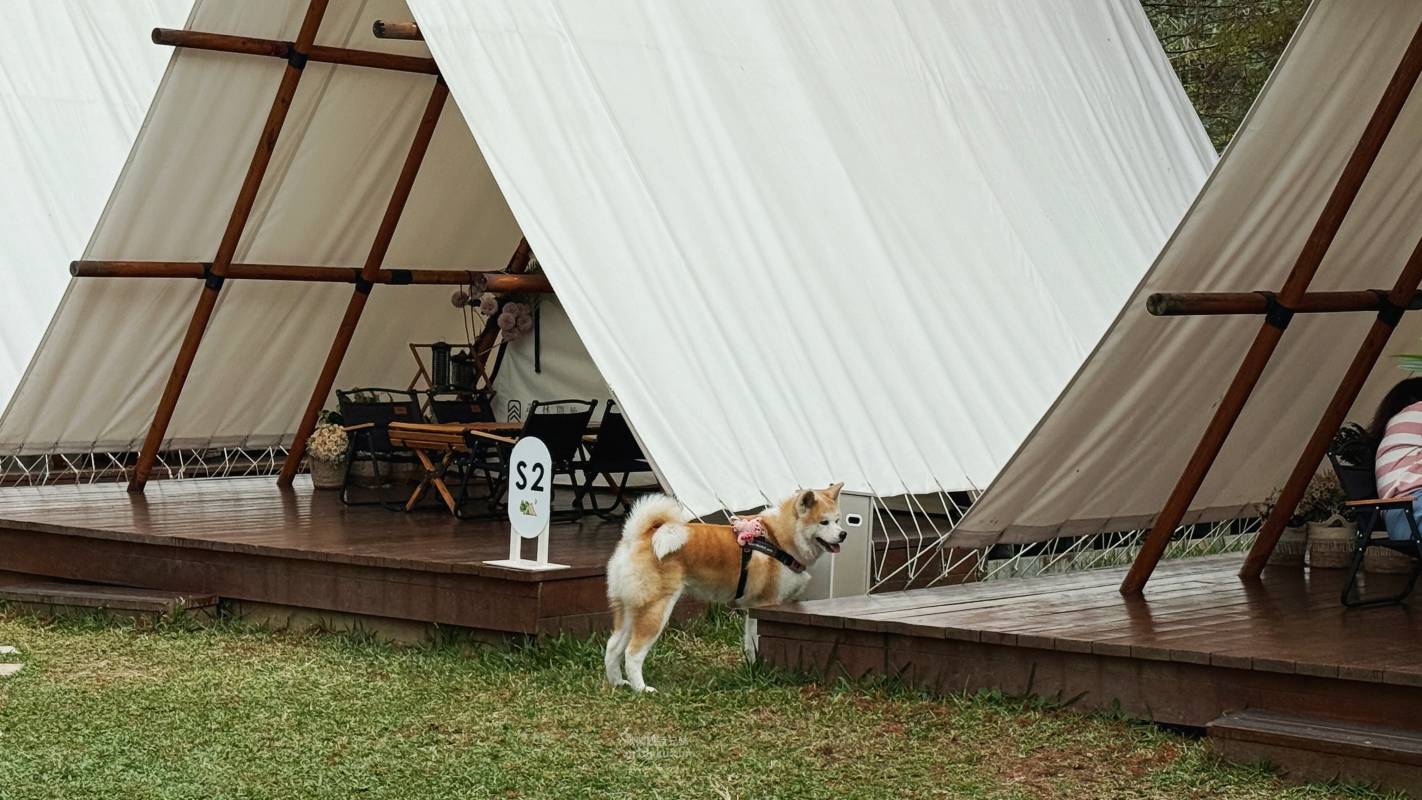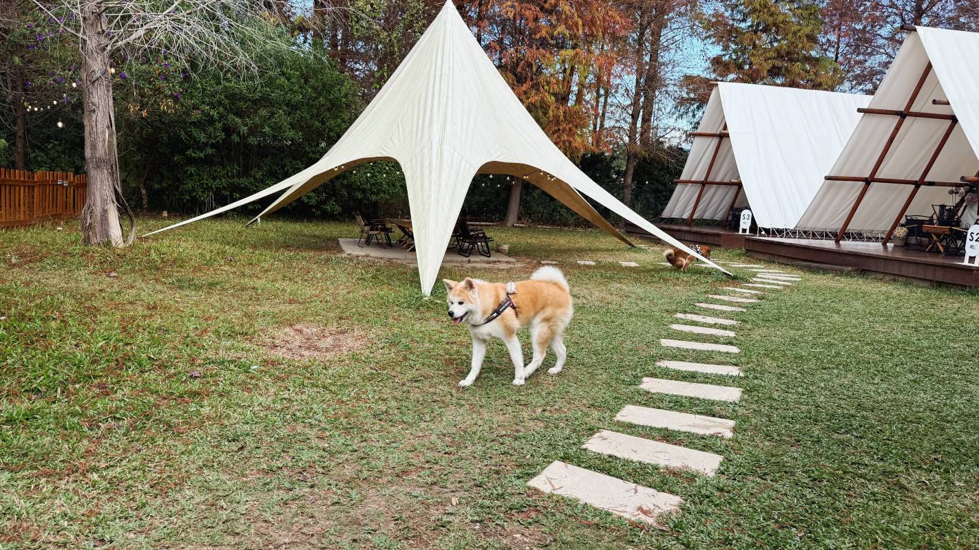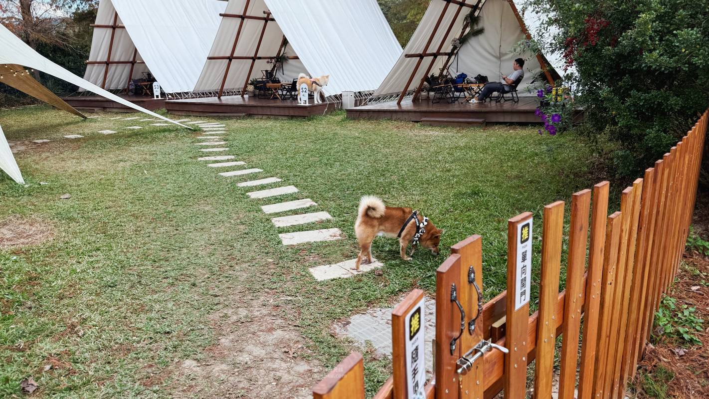 叢林開始Glamping-苗栗店設有寵物專區我覺得相當貼心!有柵欄圍起來不用擔心毛孩跑出去,擁有自己的小空地可以玩耍米豆和米穀相當開心!玩累了還能夠進帳篷休息(記得擦毛孩的腳腳哦!)而且最棒的地方是,毛孩能夠上床,太友善了吧!米豆和米穀一進到寵物專區就開始狂奔了,超級開心,能夠享受獨立的空間不被打擾!我們入住的當天隔壁兩個帳棚都沒有房客,直接整區包場超爽的(大笑) ▲小提醒:只有這區開放寵物家庭預訂哦!