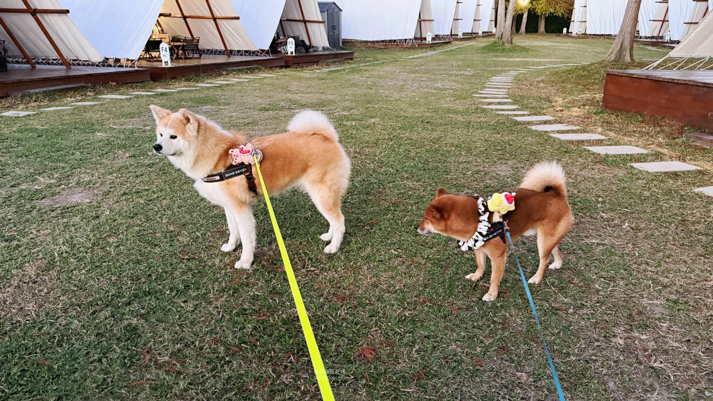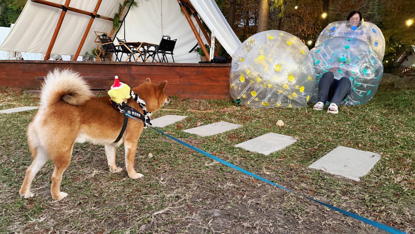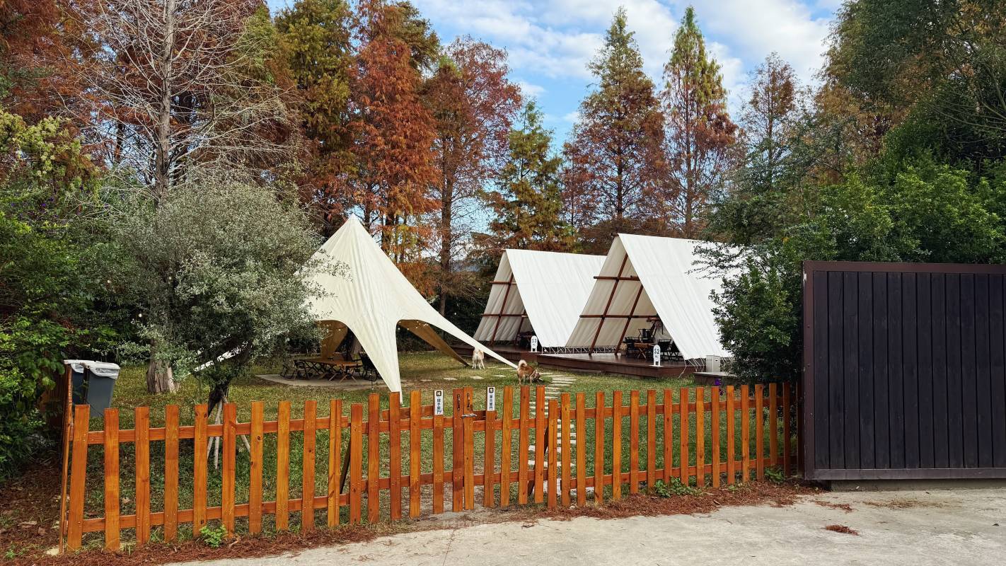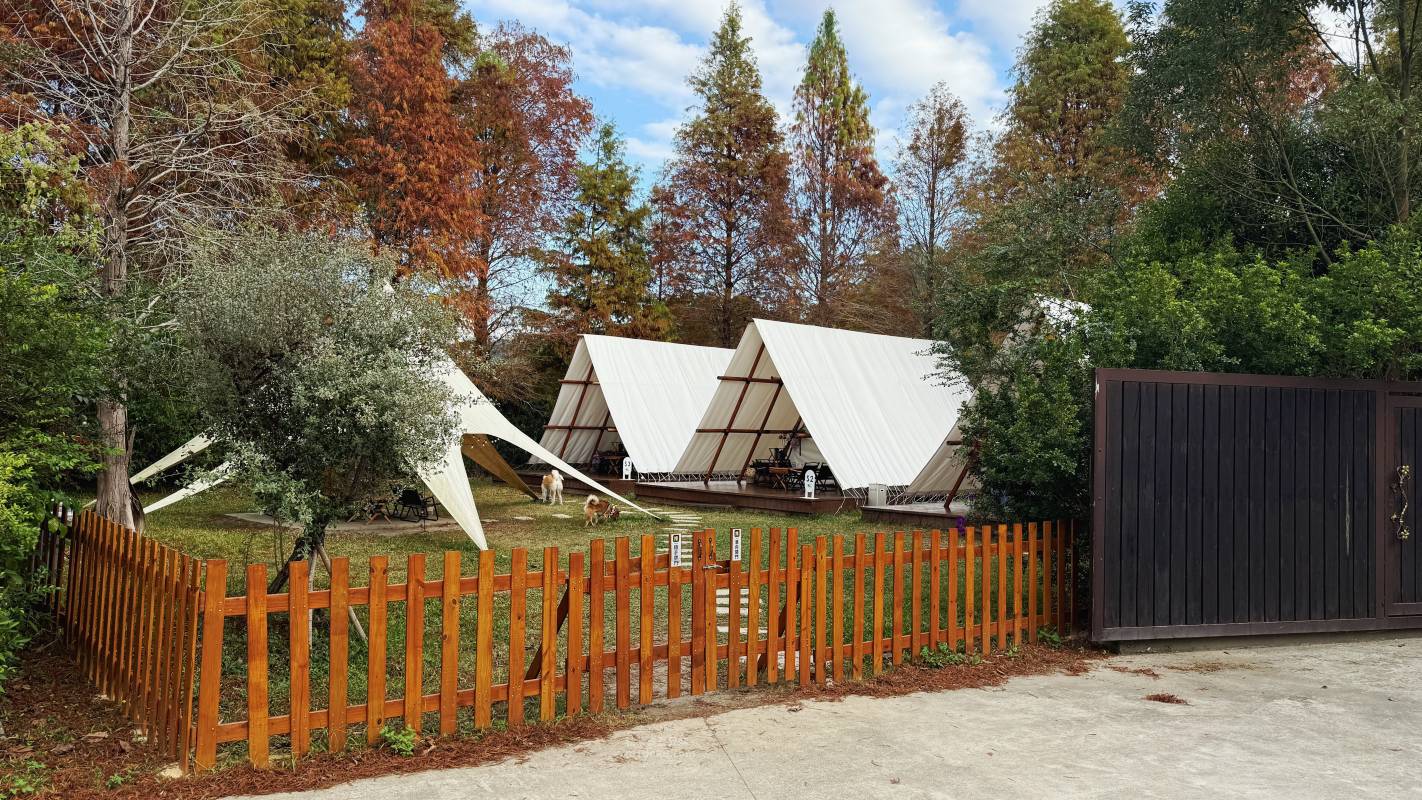 叢林開始Glamping-苗栗店設有寵物專區我覺得相當貼心!有柵欄圍起來不用擔心毛孩跑出去,擁有自己的小空地可以玩耍米豆和米穀相當開心!玩累了還能夠進帳篷休息(記得擦毛孩的腳腳哦!)而且最棒的地方是,毛孩能夠上床,太友善了吧!米豆和米穀一進到寵物專區就開始狂奔了,超級開心,能夠享受獨立的空間不被打擾!我們入住的當天隔壁兩個帳棚都沒有房客,直接整區包場超爽的(大笑) ▲小提醒:只有這區開放寵物家庭預訂哦!