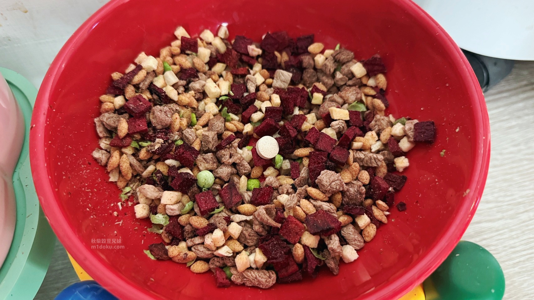 一開始我還想著:「會不會不吃?」畢竟米豆超挑嘴、米穀則是會先聞三次再決定。所以我先用直接餵食的方式讓他們吃吃看,但意外的是,這顆小小的膚沛錠,沒有刺鼻味也沒有很化學的味道,直接給他們吃,完全沒有排斥耶!於是我試著放入飼料讓他們一起食用,剛開始他們沒有主動靠近(畢竟不愛吃飼料XD),等到隔天早上醒來時,看了一下他們碗內是不是還維持原狀,發現整個碗是空的,連膚沛錠都不見了!(他們最喜歡半夜吃消夜XD)